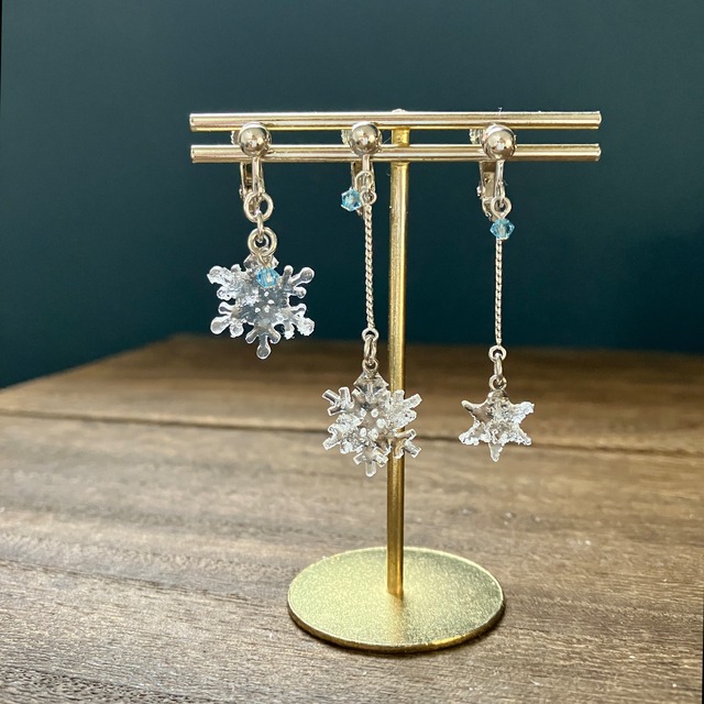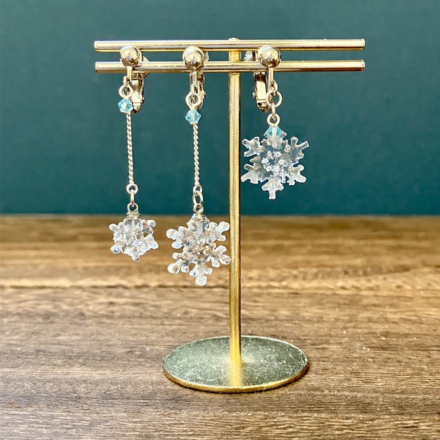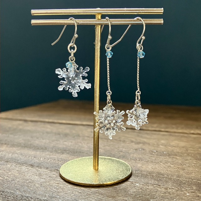●ご注意ください イヤリング(ねじバネ式)に+150円で変更可能ですので、ご希望の方は必ずオプション選択をお願い致します。 ご購入後のパーツ変更はご購入時の平等性や梱包ミス防止のため承っておりません。 雪の結晶モチーフのシンプルな耳飾り。 質感や雪の粒をリアルに表現しました。 スワロフスキーも一粒ワンポイントに取り付けて、冬限定の耳飾りに仕上げました。 サイズ…全長約3.8cm〜4cm *雪の結晶はデザイン上、繊細な部分があります レジンやコーティング液で補強しておりますが、どうしても細い部分は折れやすいです。 落下させたり負荷をかけすぎないように、お取り扱いには十分にご注意ください。 また、雪の粒がニットやマスク紐に引っかかりやすくなっておりますので、お気をつけください。 ◯ご購入時の注意点◯ ・照明のあたり具合によって見え方が変わる場合がございます。 ・ハンドメイド商品ですので丁寧に1つひとつお作りしていますが、作成の際に多少のズレや小さなキズが入ってしまう場合がございます。 ・完璧な商品、気になる方は購入をお控え下さい。(気泡はわざと入れています。) ご理解頂きますようよろしくお願いします(^^) ご不明点がございましたらお気軽にお申し付けくださいませ(*^^*)