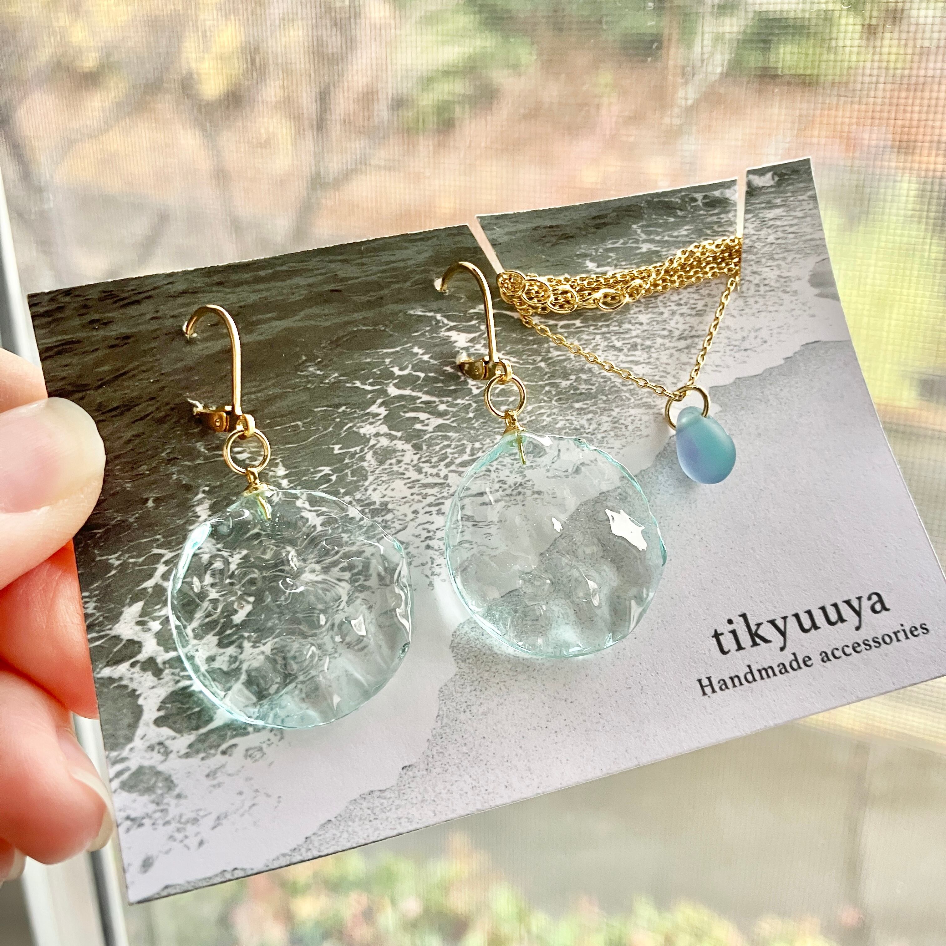 水面ピアス&ブルーグリーンのチェコビーズネックレス