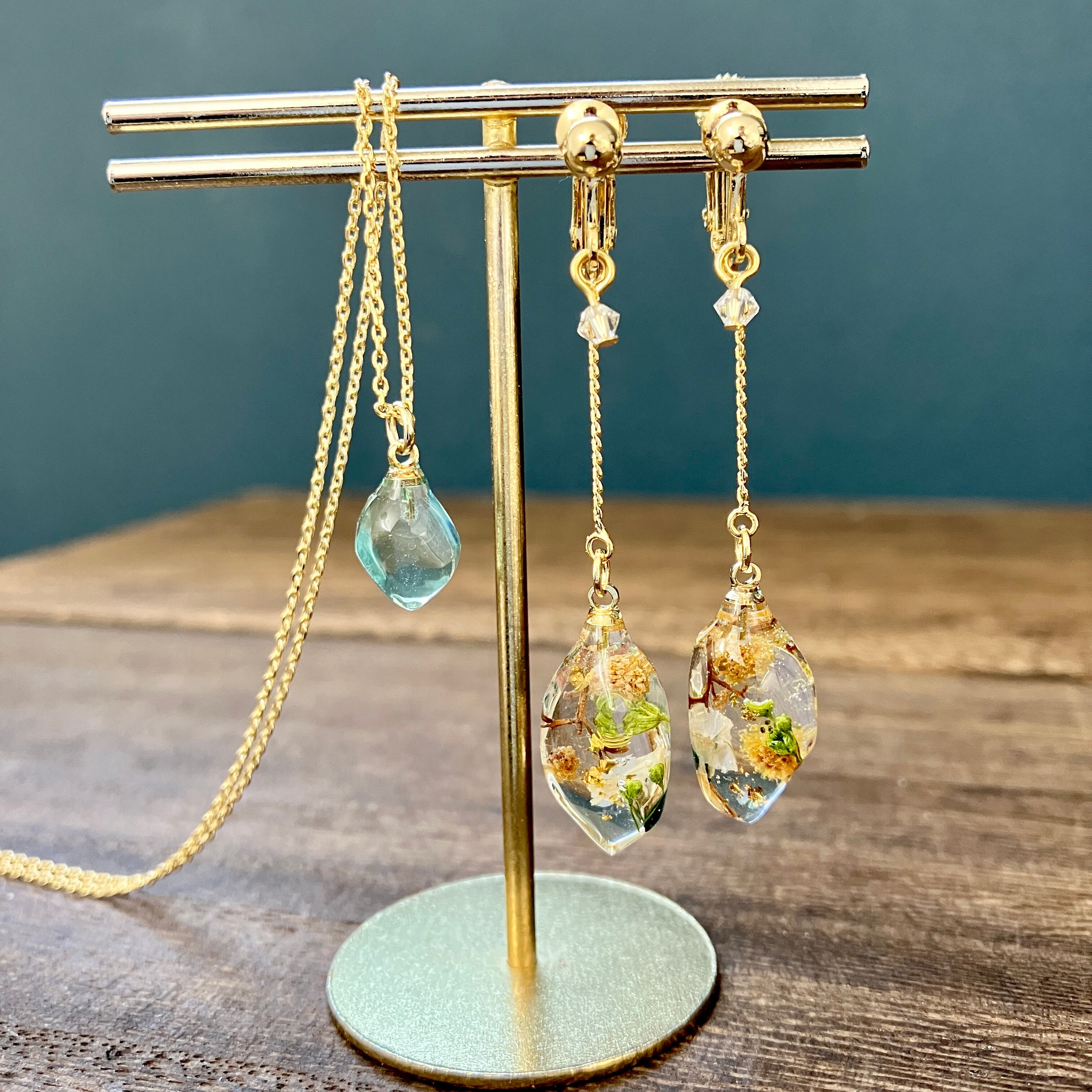 ゆらゆら小さな鉱石イヤリング&ネックレス ミモザの花鉱石