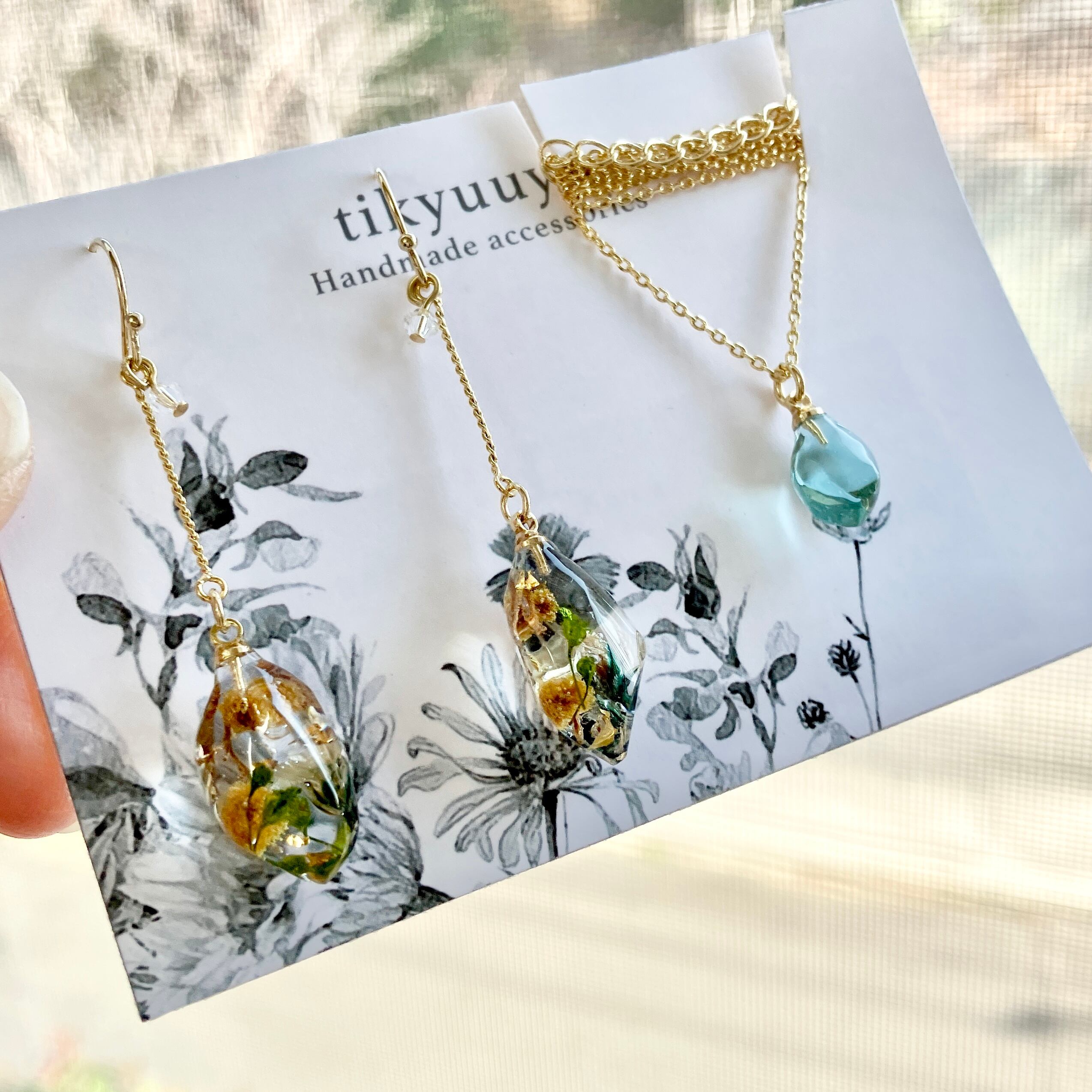 ゆらゆら小さな鉱石ピアス&ネックレス ミモザの花鉱石