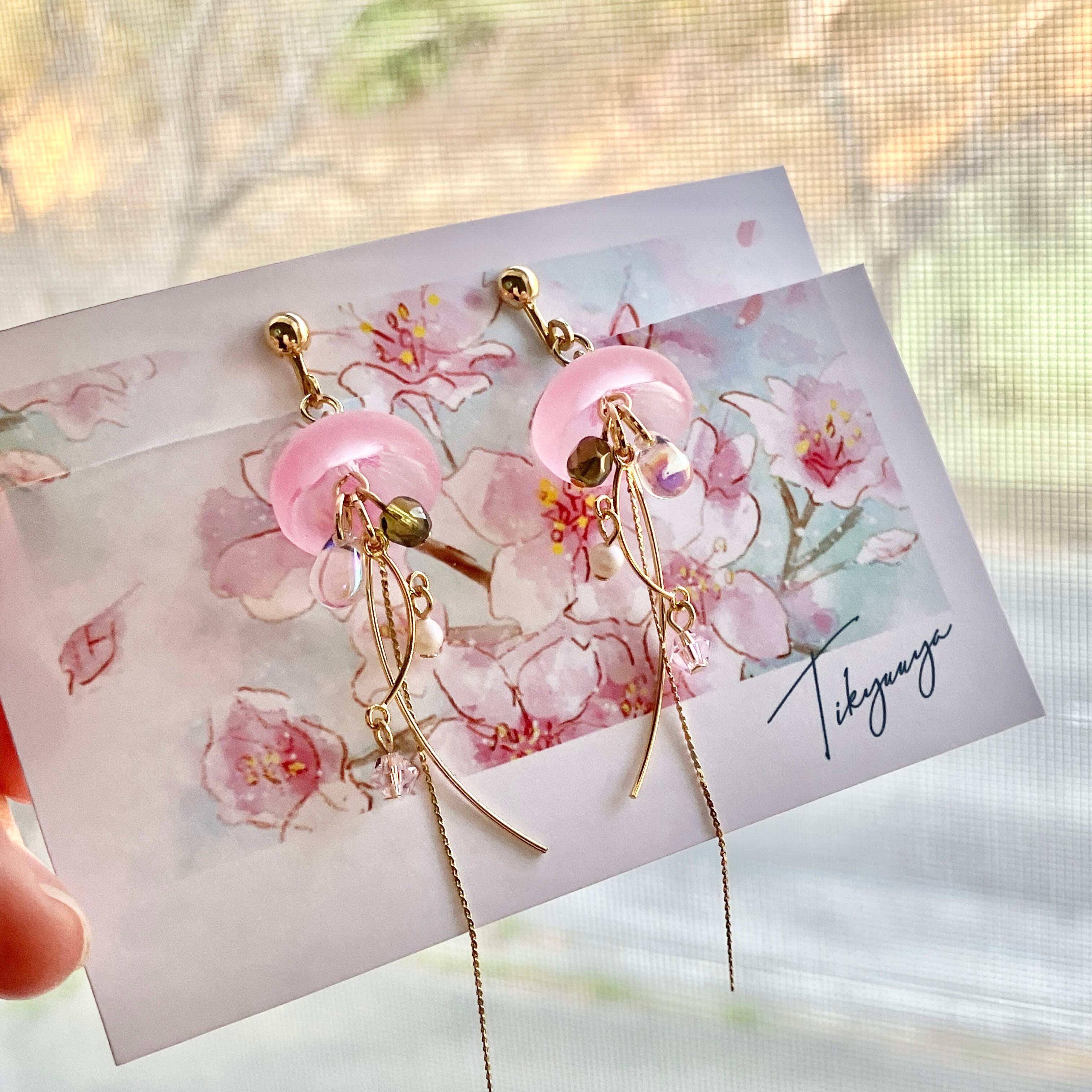 桜と海月をモチーフにしたゆらゆら揺れる耳飾り。