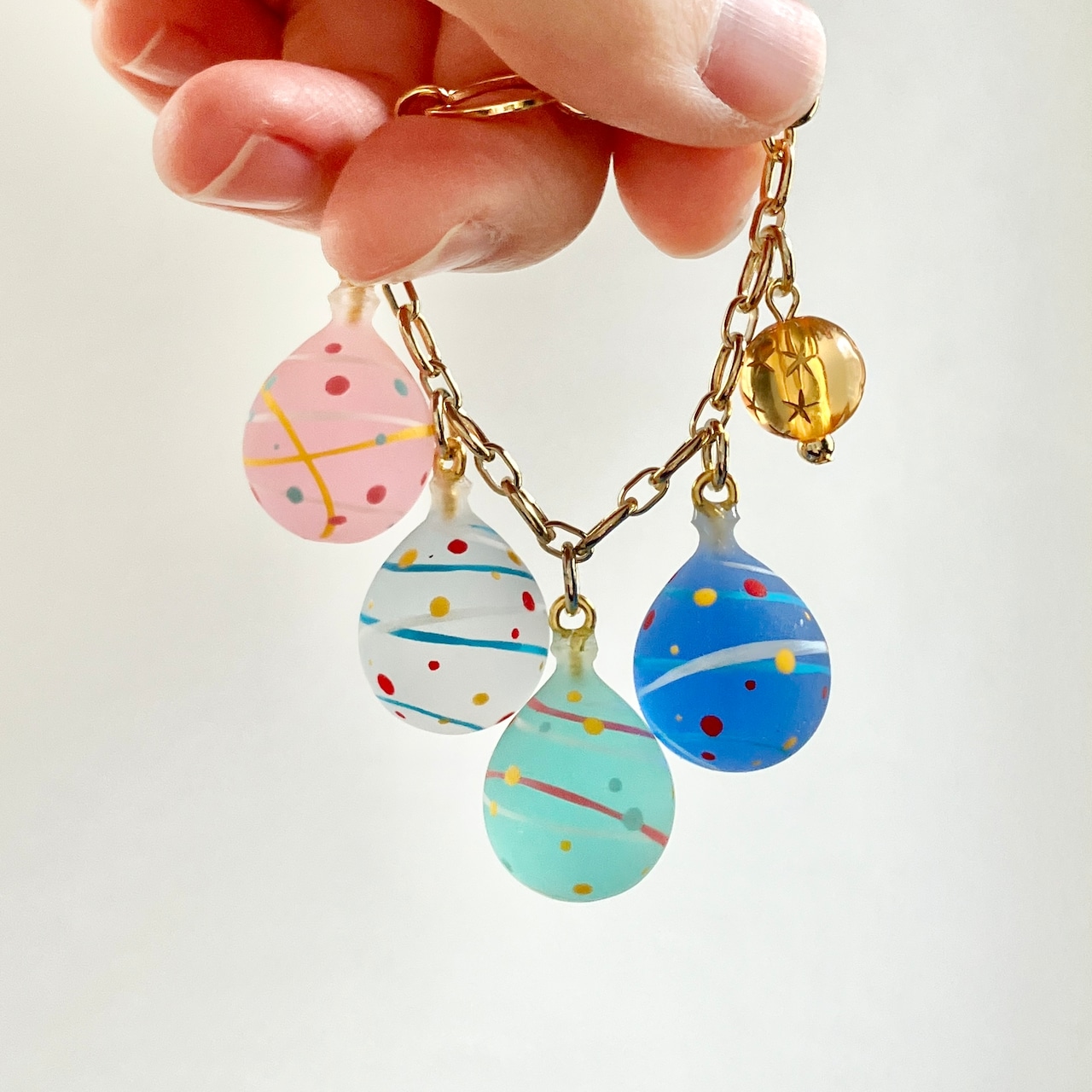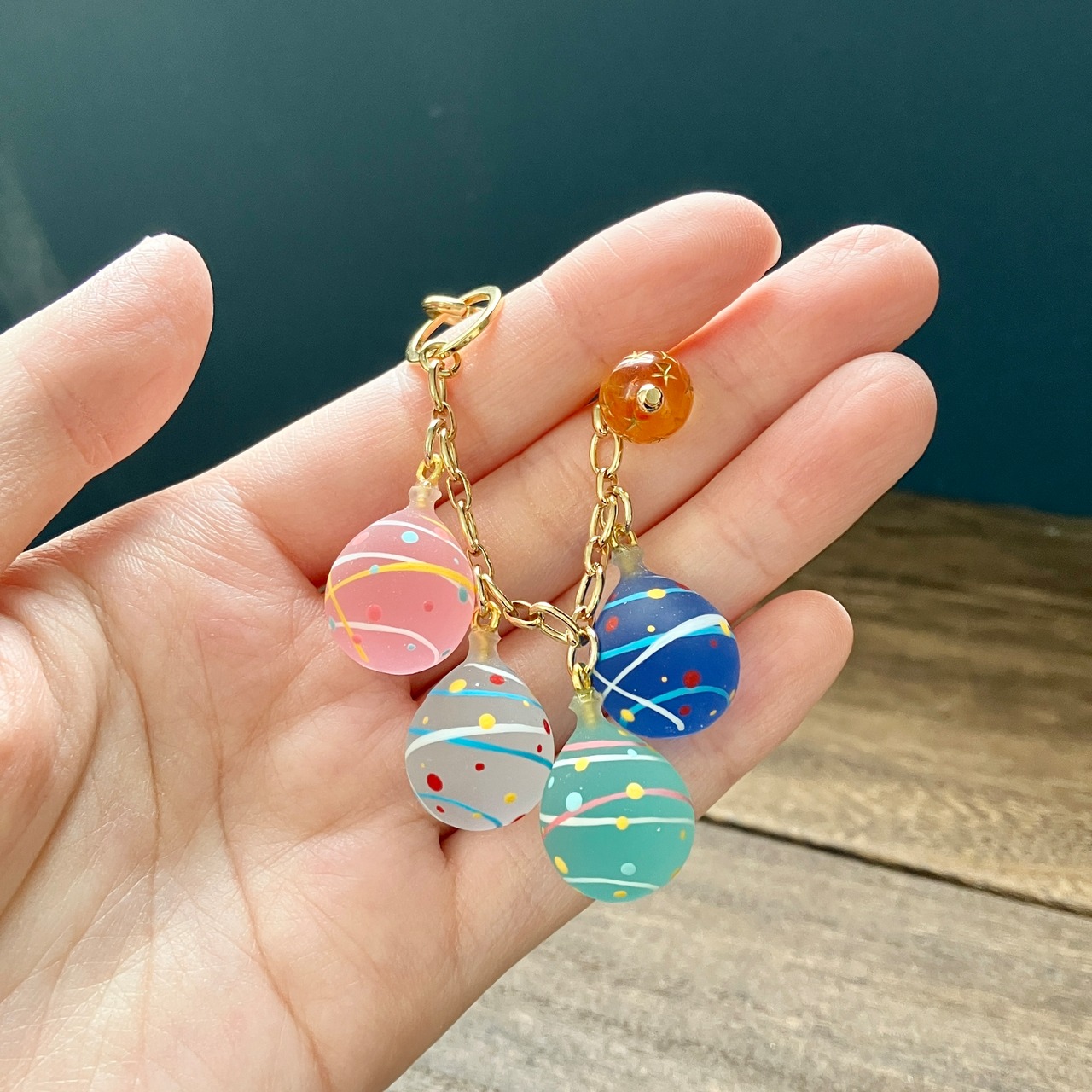 4色の水風船を楽しめるバックチャームを作りました。