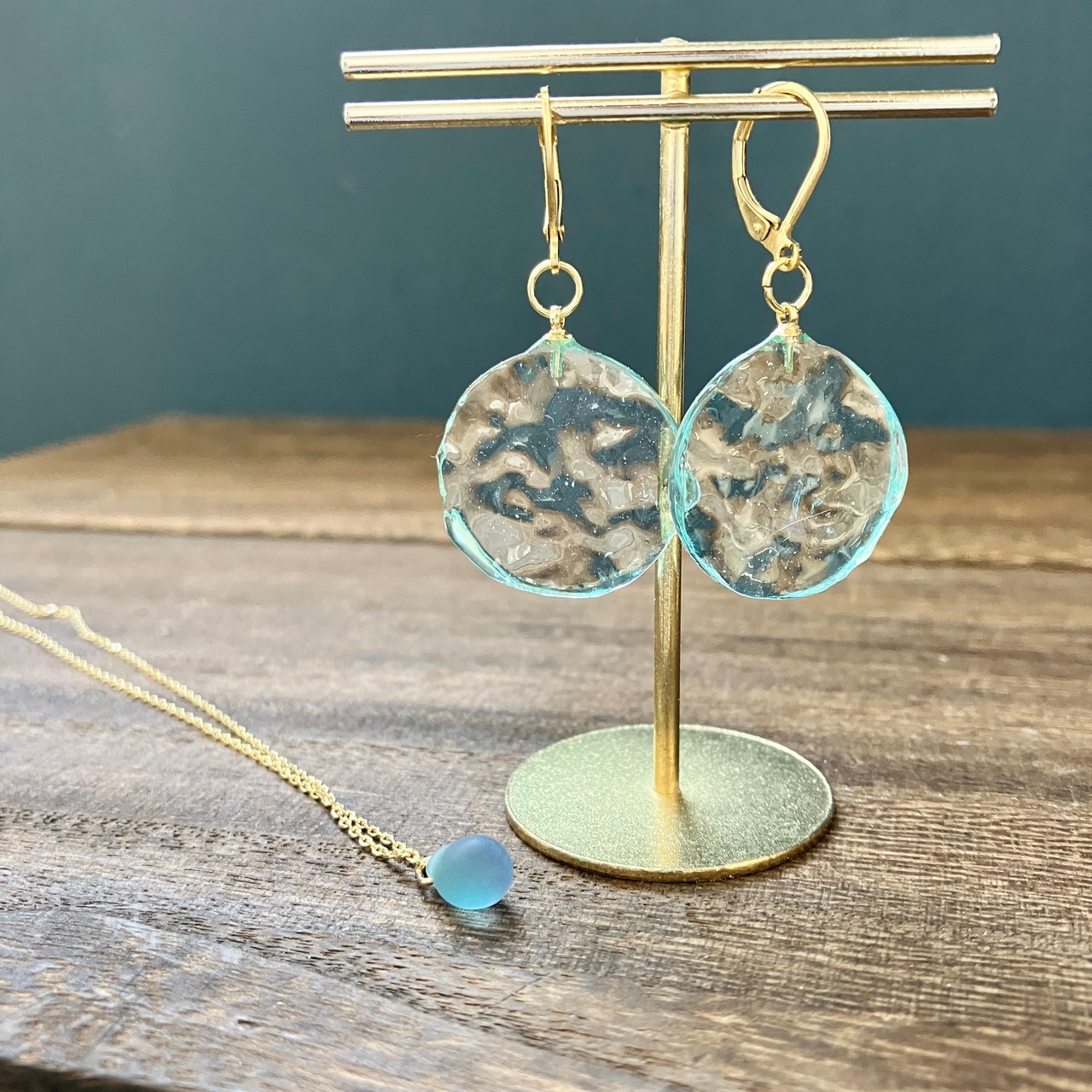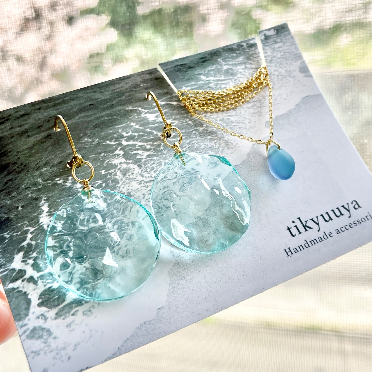 水面ピアス&ブルーグリーンのチェコビーズネックレス