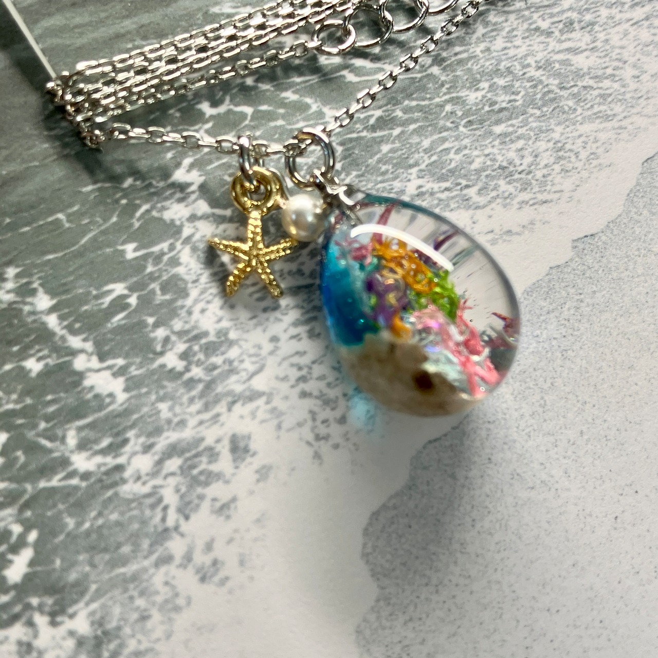 小さな卵ネックレス15ミリ「サンゴ礁」 ヒトデチャーム付き