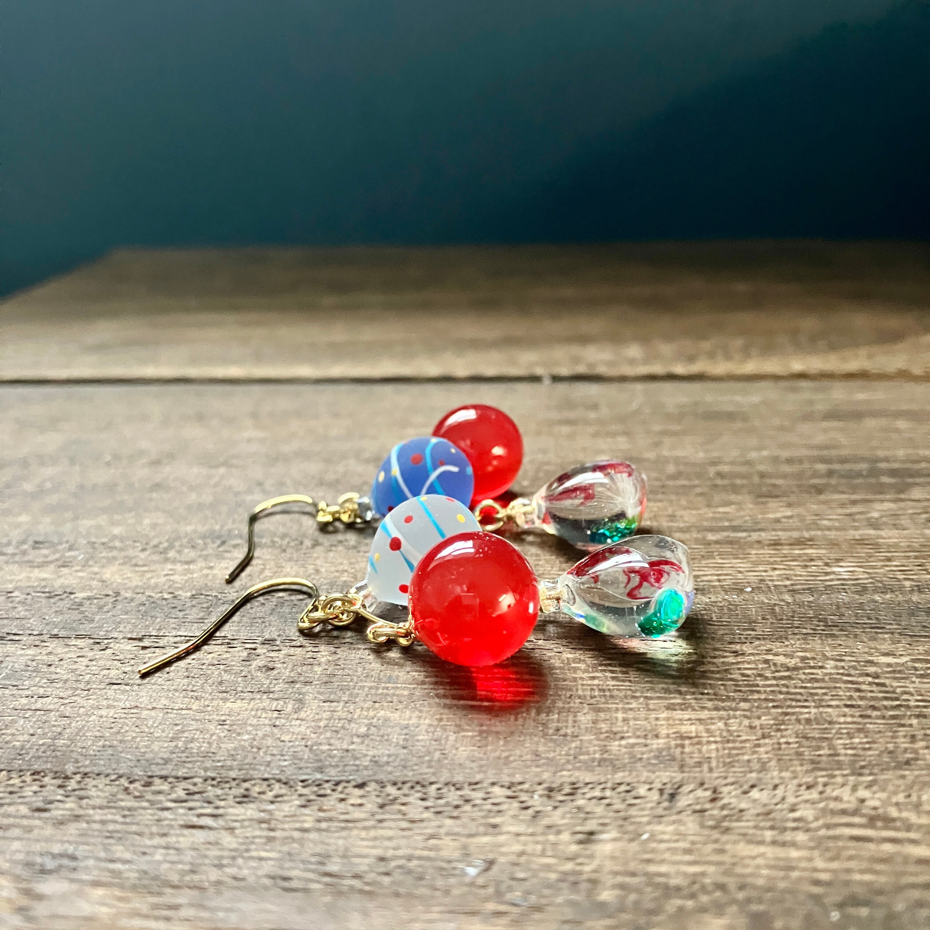 りんご飴、金魚すくい、水風船が一気に楽しめるよくばりな耳飾りが出来ました(^^)