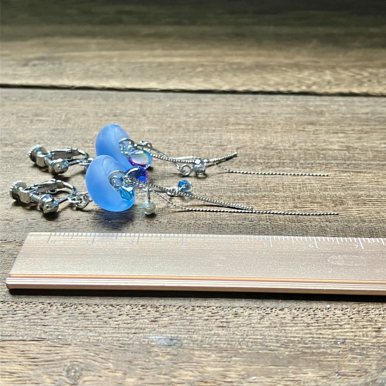 ブルー系統のビーズやパールビーズがキラキラ揺れ、耳元を華やかに彩ってくれます。