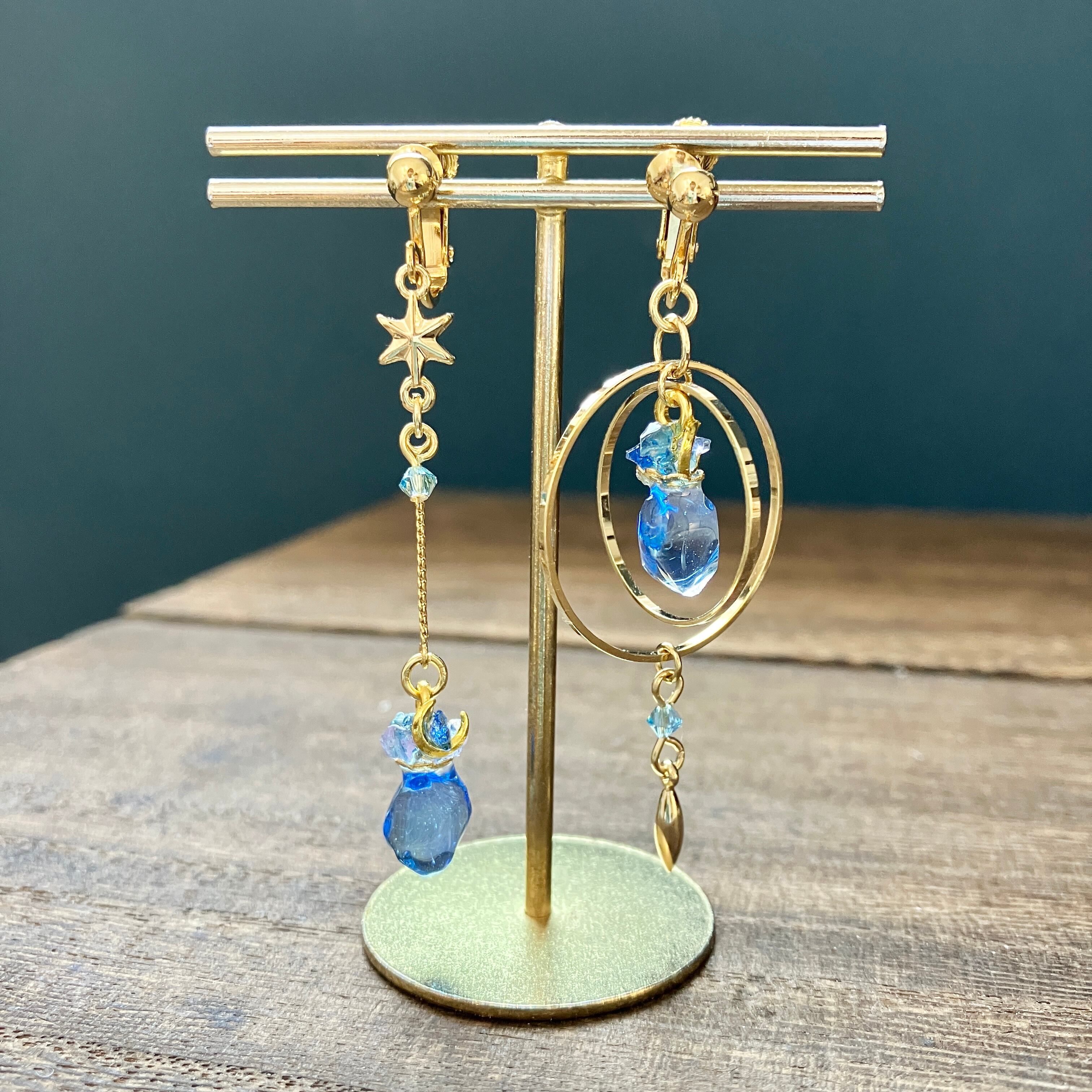 繊細な鉱石を星モチーフの金具で彩り、ファンタジー雰囲気の漂う耳飾りに仕上げました。