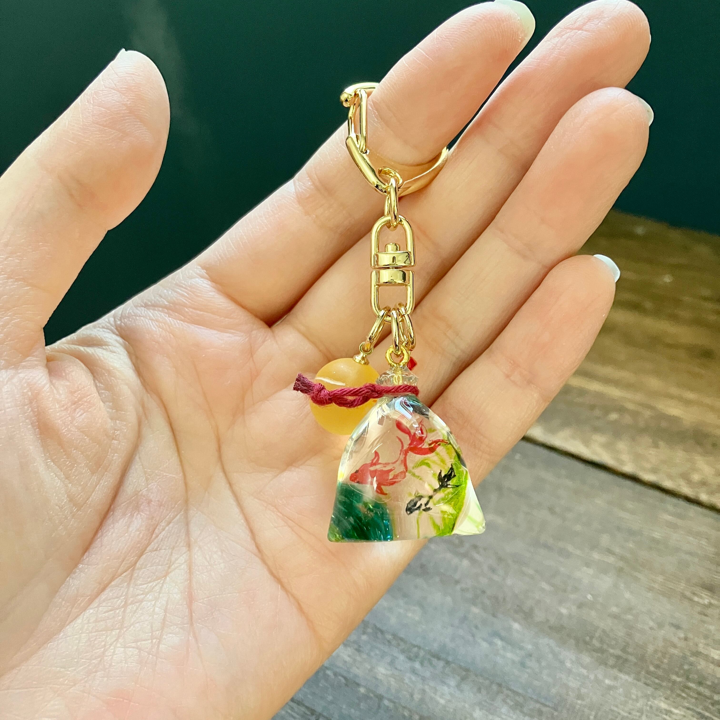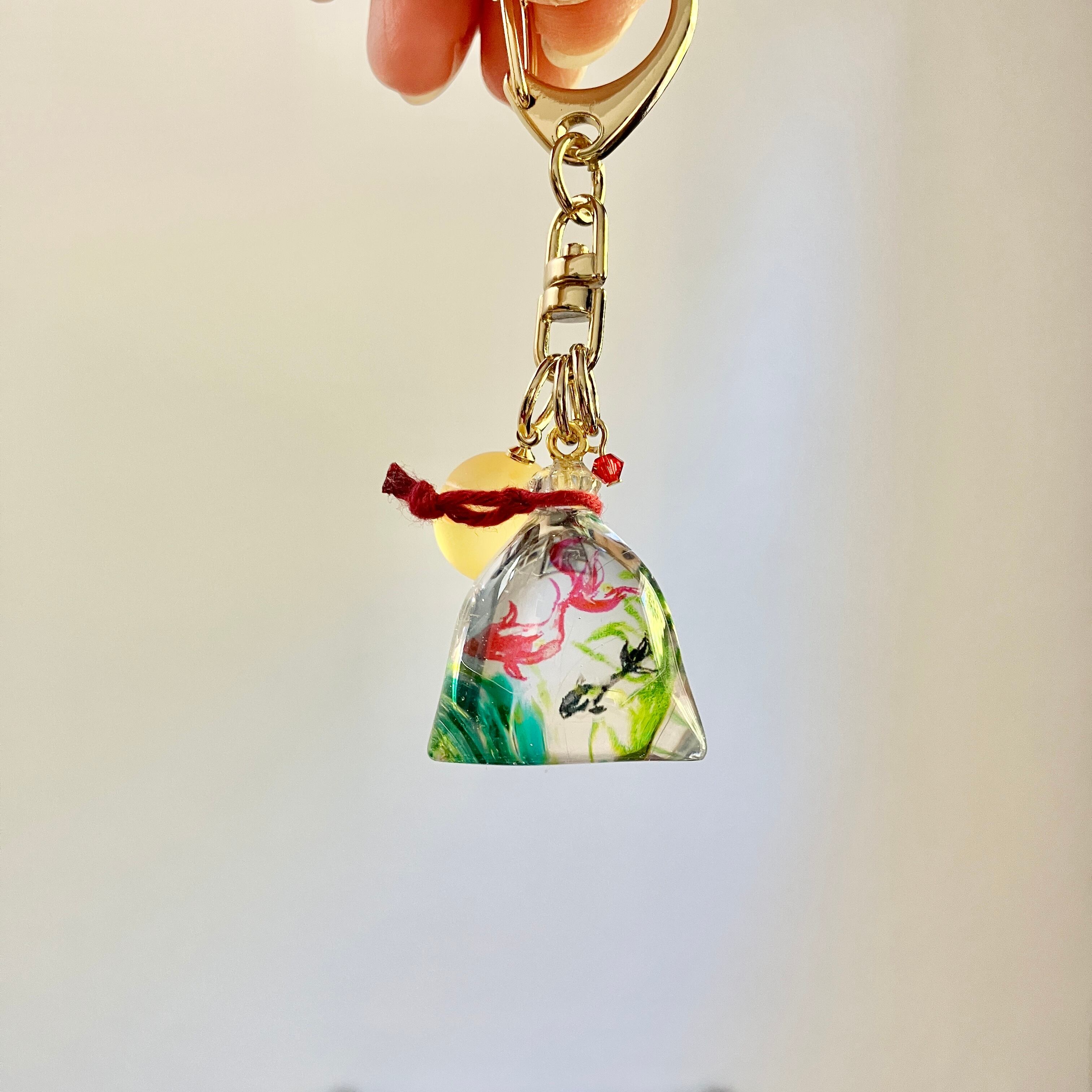 金魚袋にヨーヨーチャームを組み合わせた夏祭りの雰囲気を楽しめるキーホルダーを作りました。