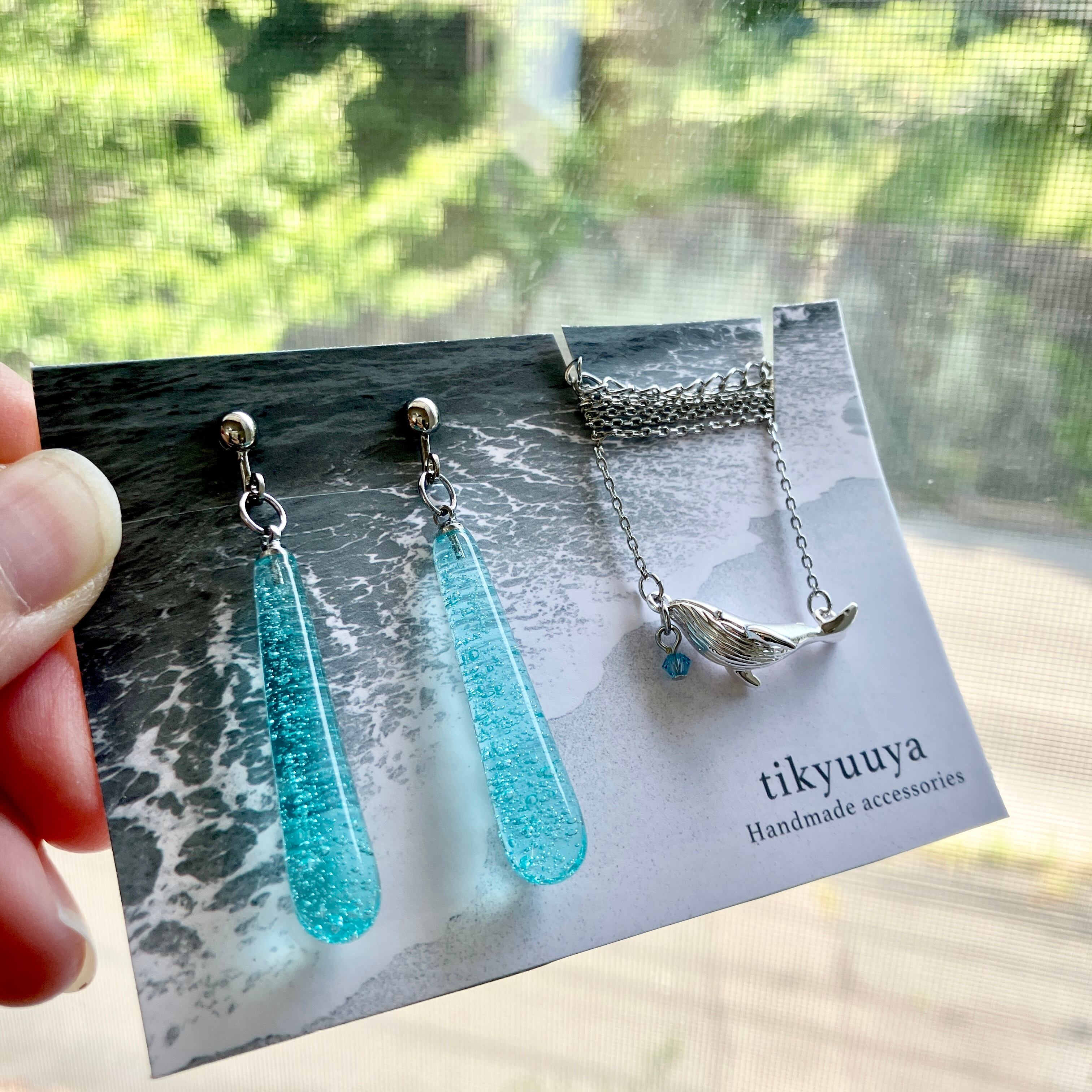 海のかけらドロップイヤリング&クジラチャームのネックレス