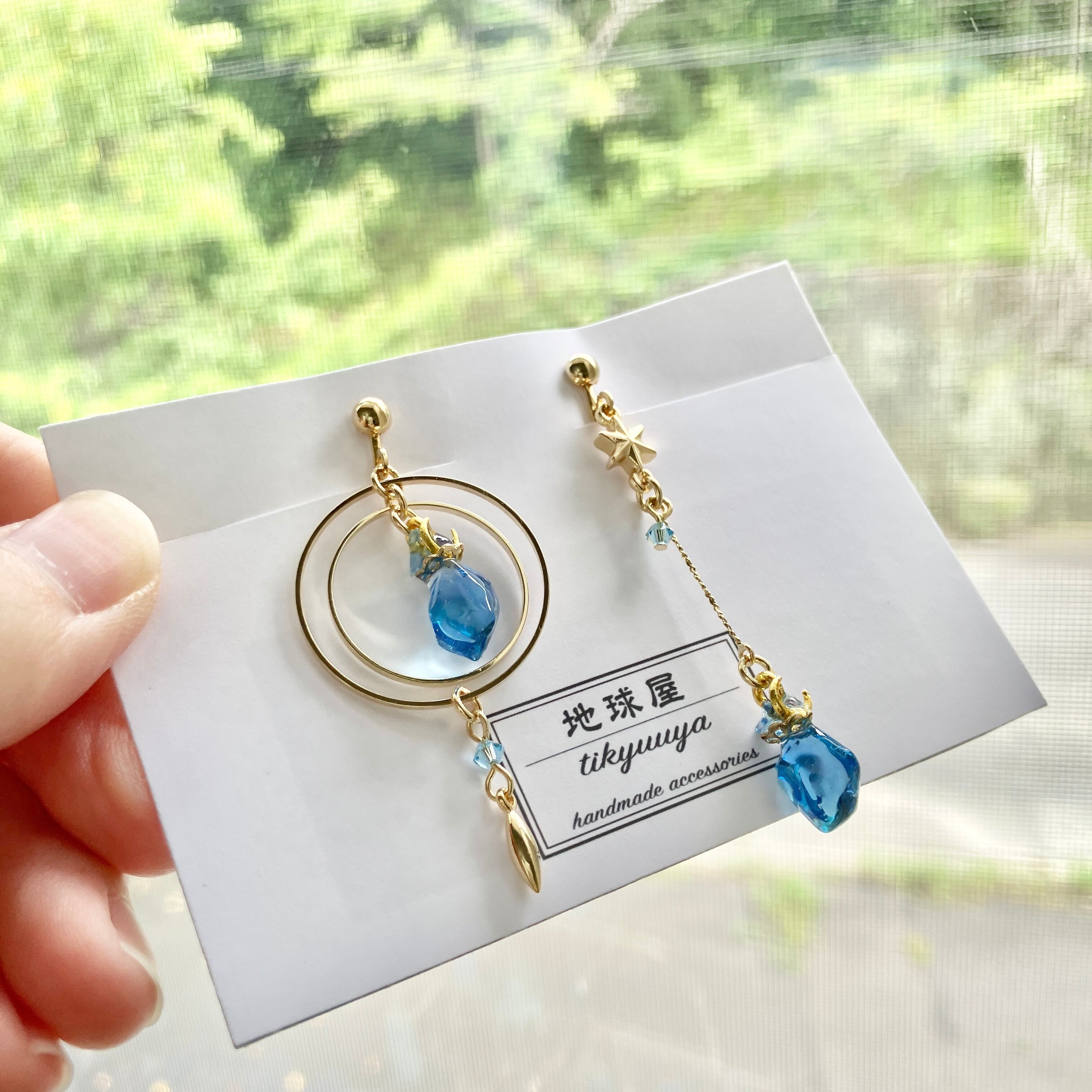 繊細な鉱石を星モチーフの金具で彩り、ファンタジー雰囲気の漂う耳飾りに仕上げました。