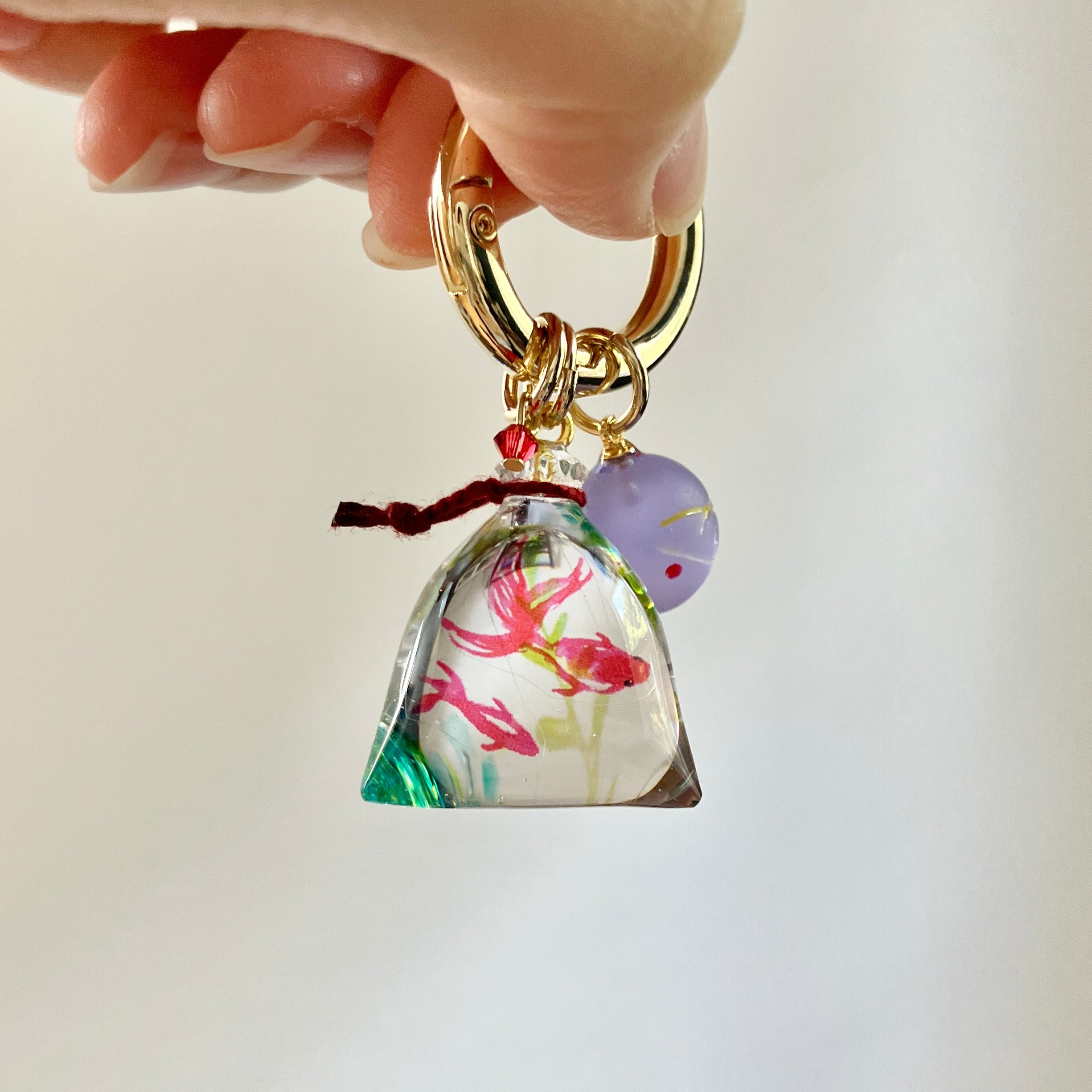 金魚袋にヨーヨーチャームを組み合わせた夏祭りの雰囲気を楽しめるキーホルダーを作りました。
