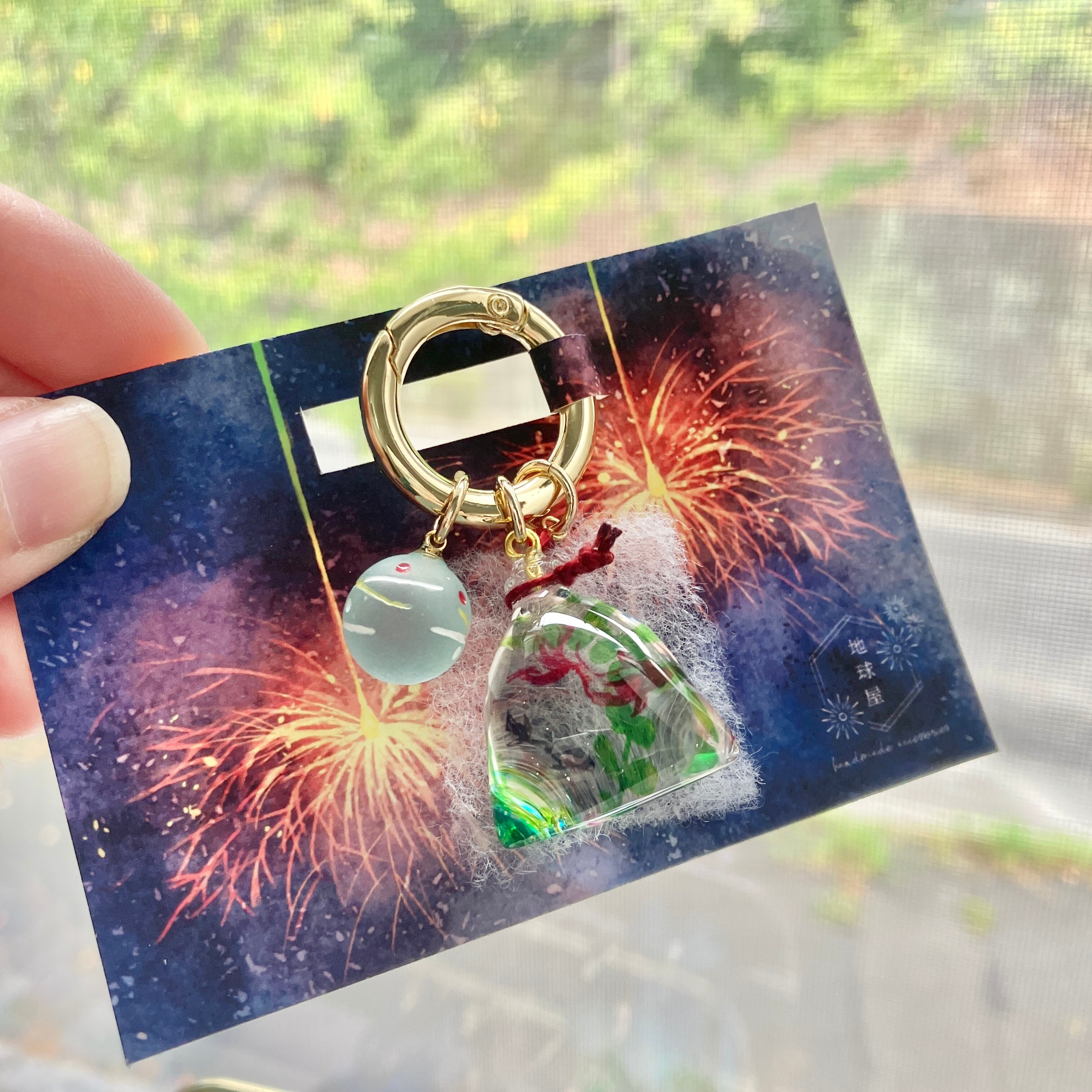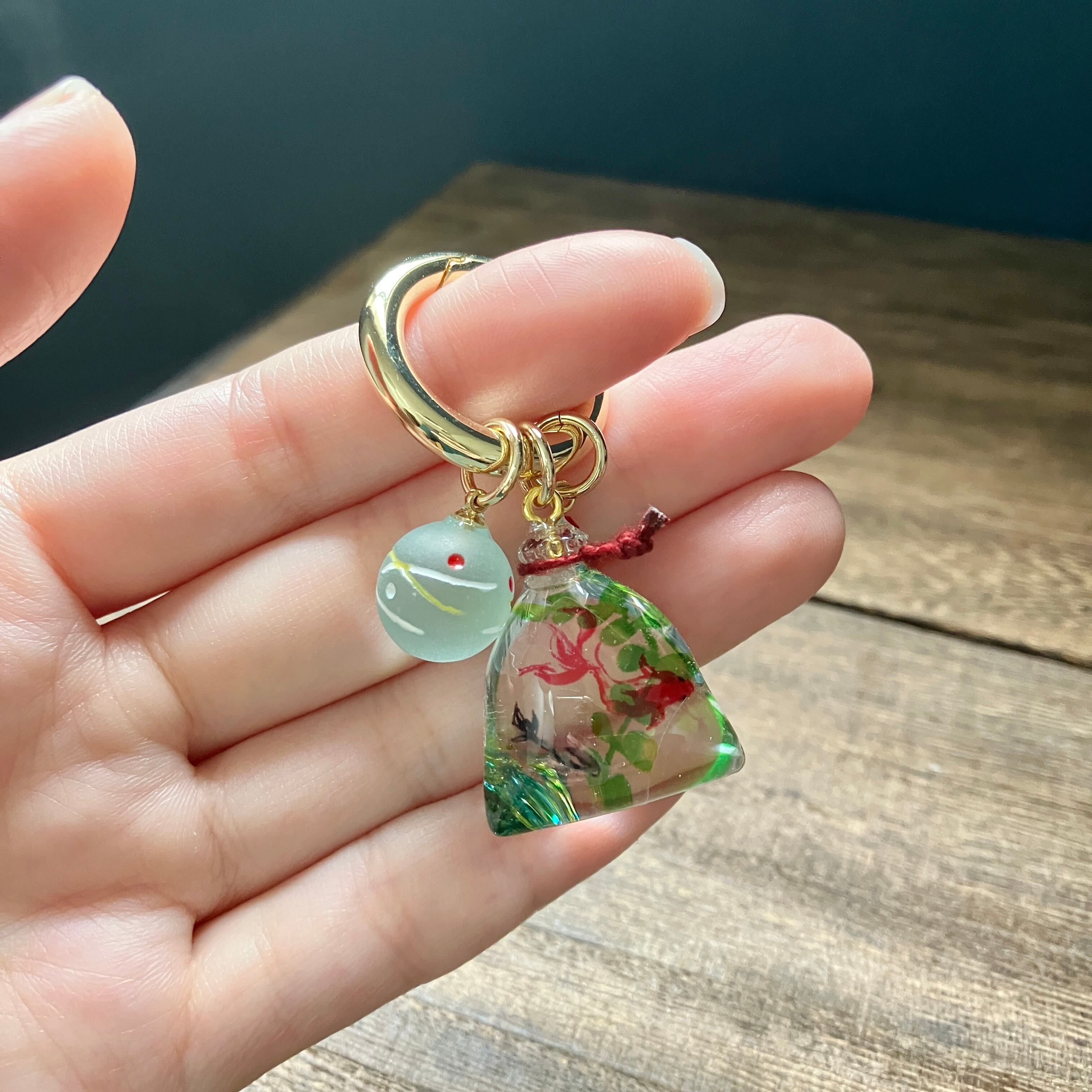 金魚袋にヨーヨーチャームを組み合わせた夏祭りの雰囲気を楽しめるキーホルダーを作りました。