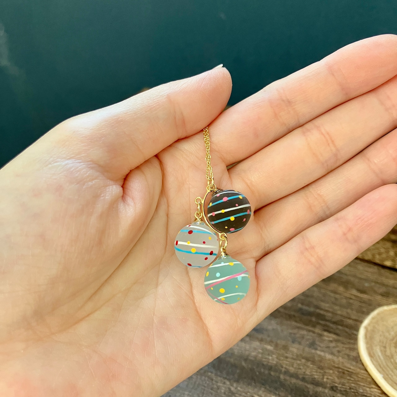 小さな水風船を3色組み合わせてネックレスに仕立てました。