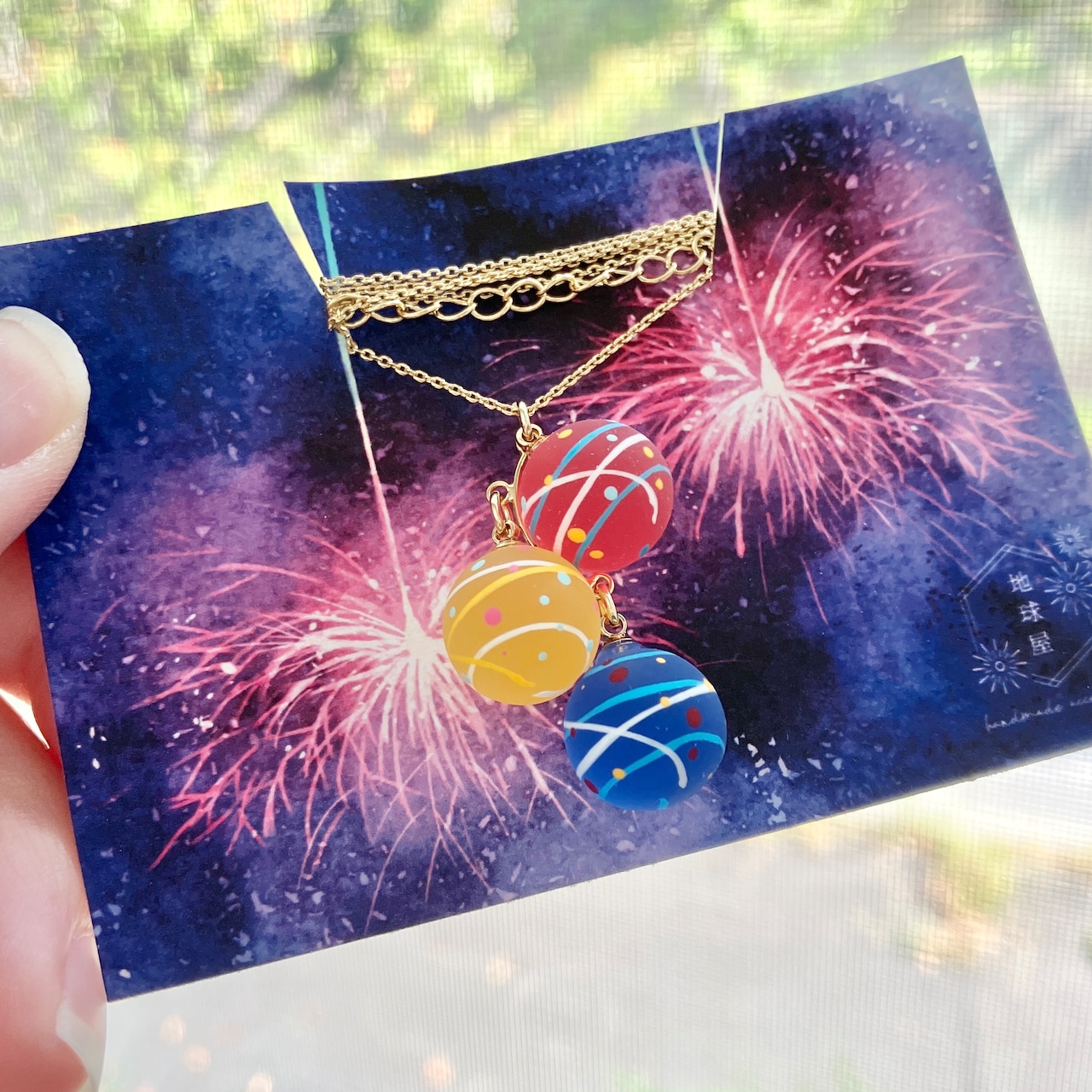 小さな水風船を3色組み合わせてネックレスに仕立てました。