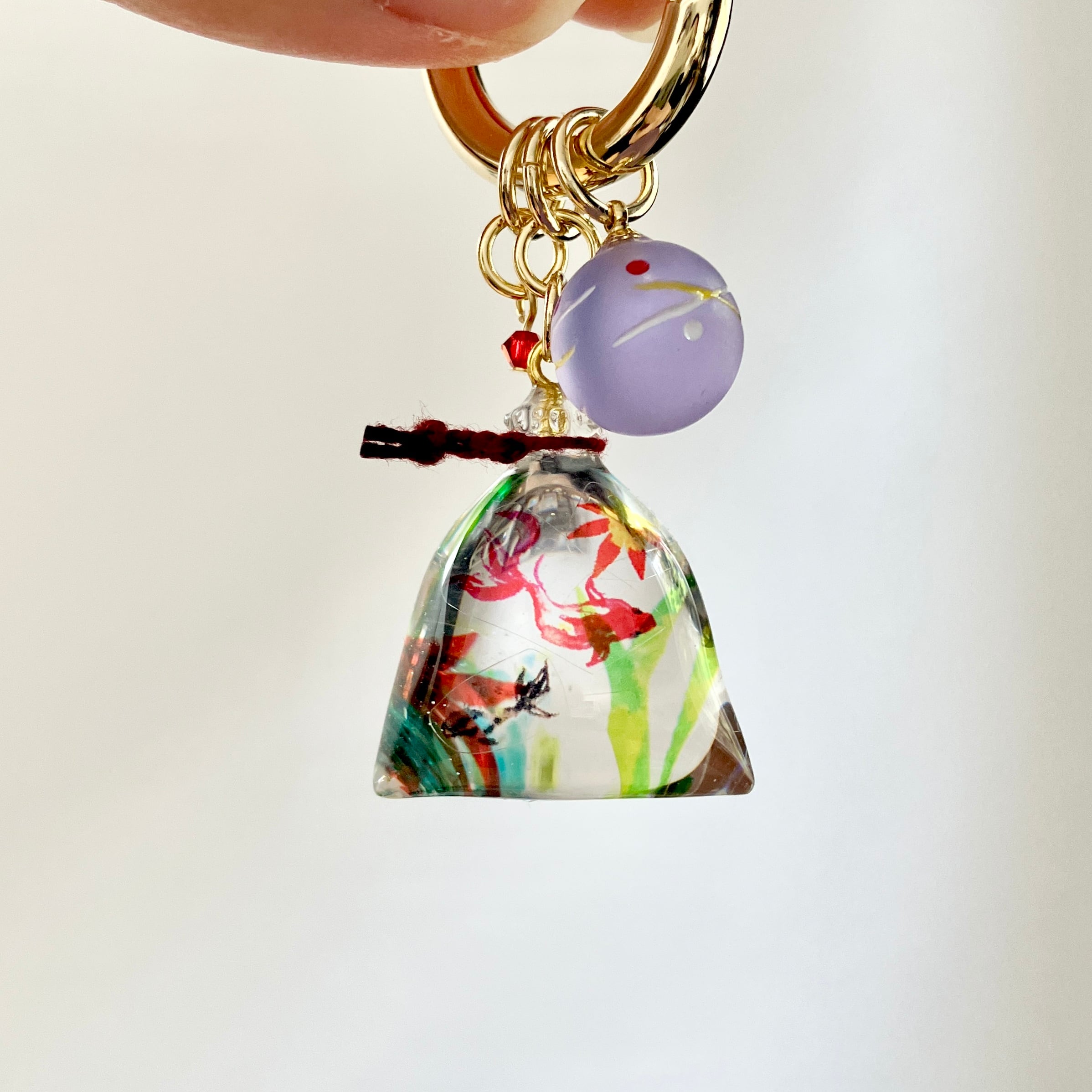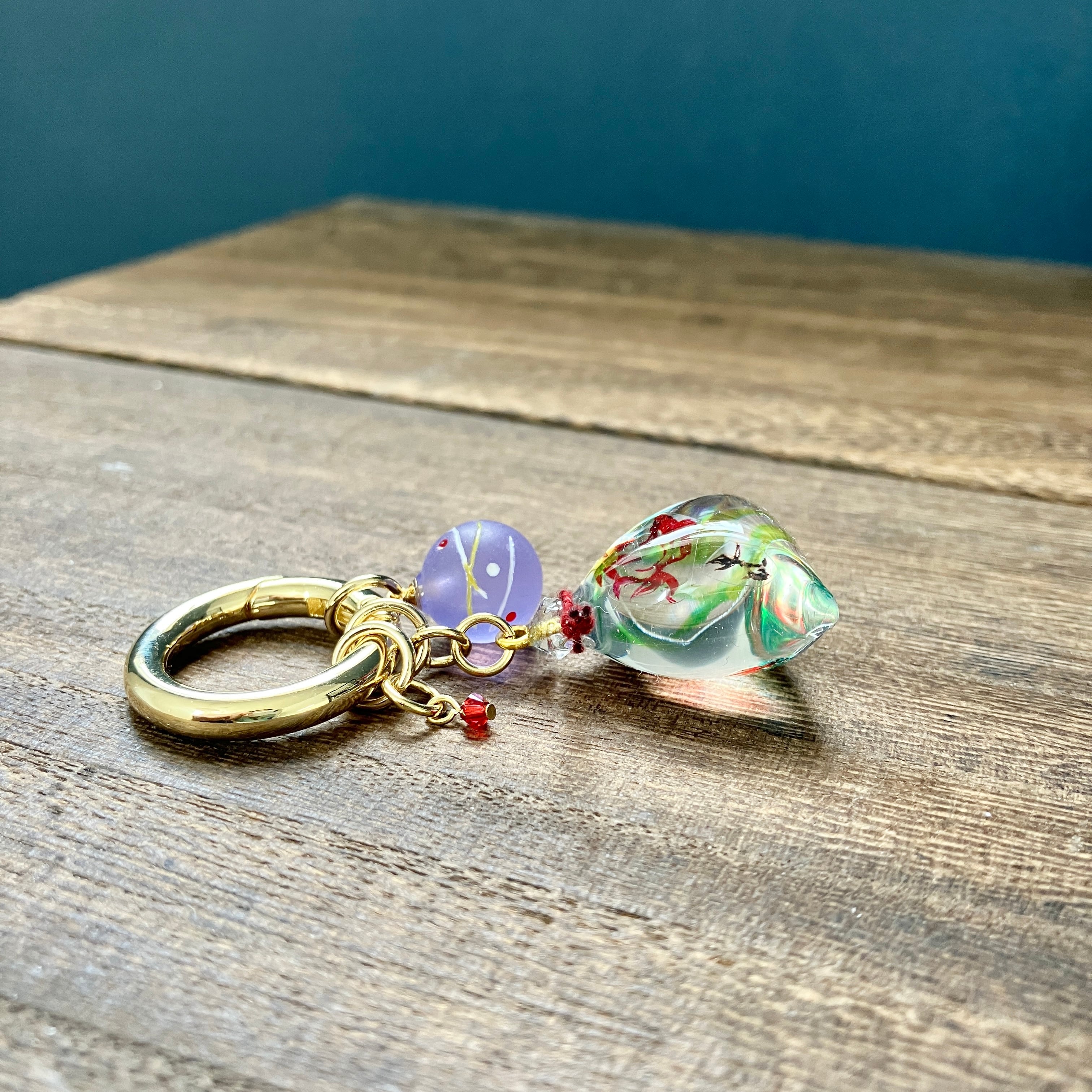 紅葉入りの金魚袋にヨーヨーチャームを組み合わせた秋とお祭りの雰囲気を楽しめるキーホルダーを作りました。