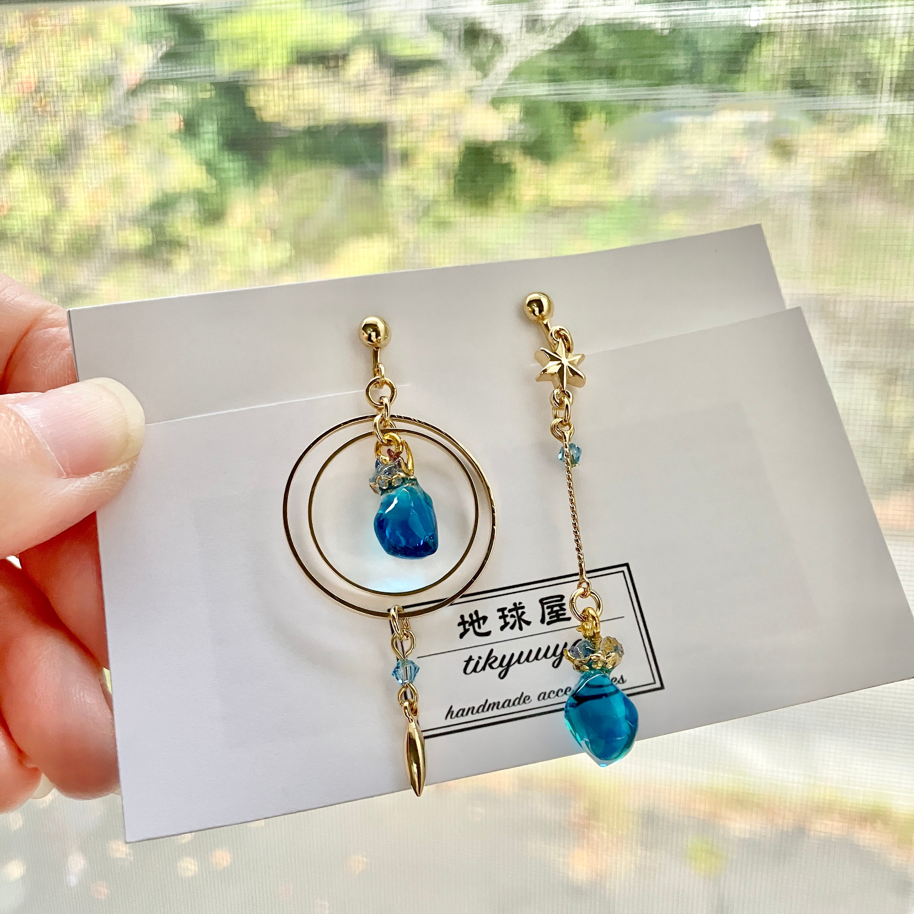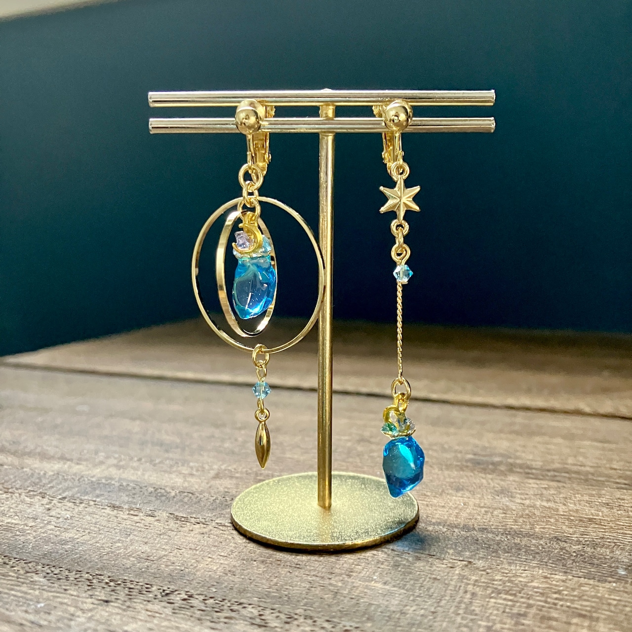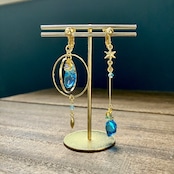 繊細な鉱石を星モチーフの金具で彩り、ファンタジー雰囲気の漂う耳飾りに仕上げました。