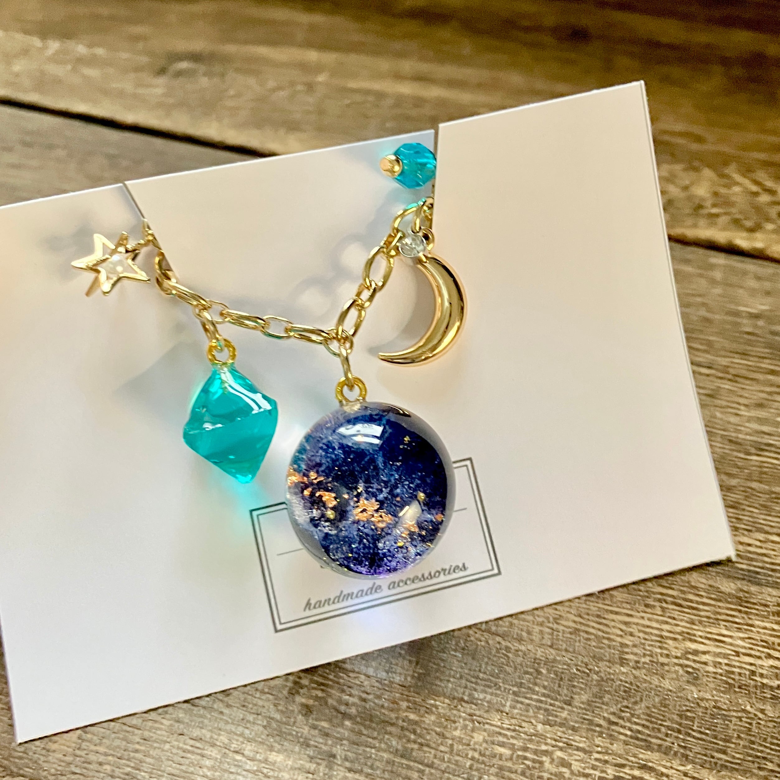 月や星のチャームと鉱石のモチーフを組み合わせて天体がお好きな方にぴったりの作品に仕上がりました(^^)