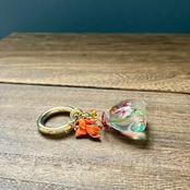 紅葉入りの金魚袋に金魚チャームを組み合わせた秋とお祭りの雰囲気を楽しめるキーホルダーを作りました。
