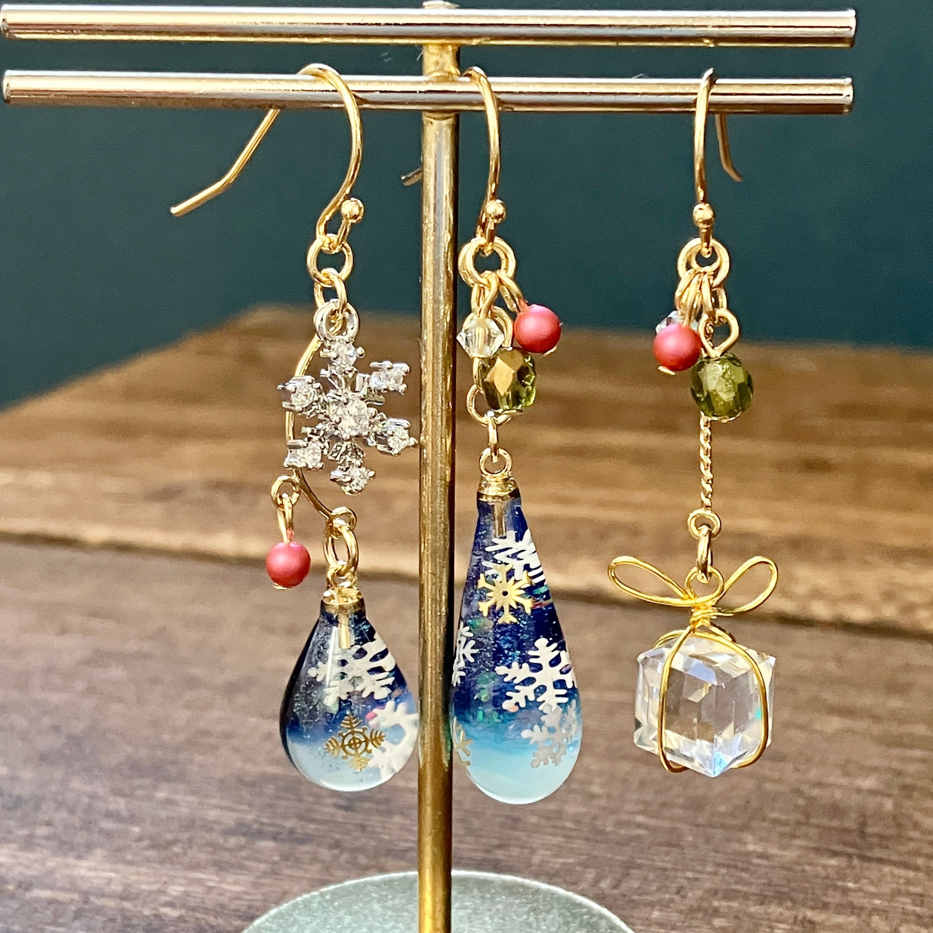 スワロフスキーもワンポイントに取り付けて、冬限定の耳飾りに仕上げました。