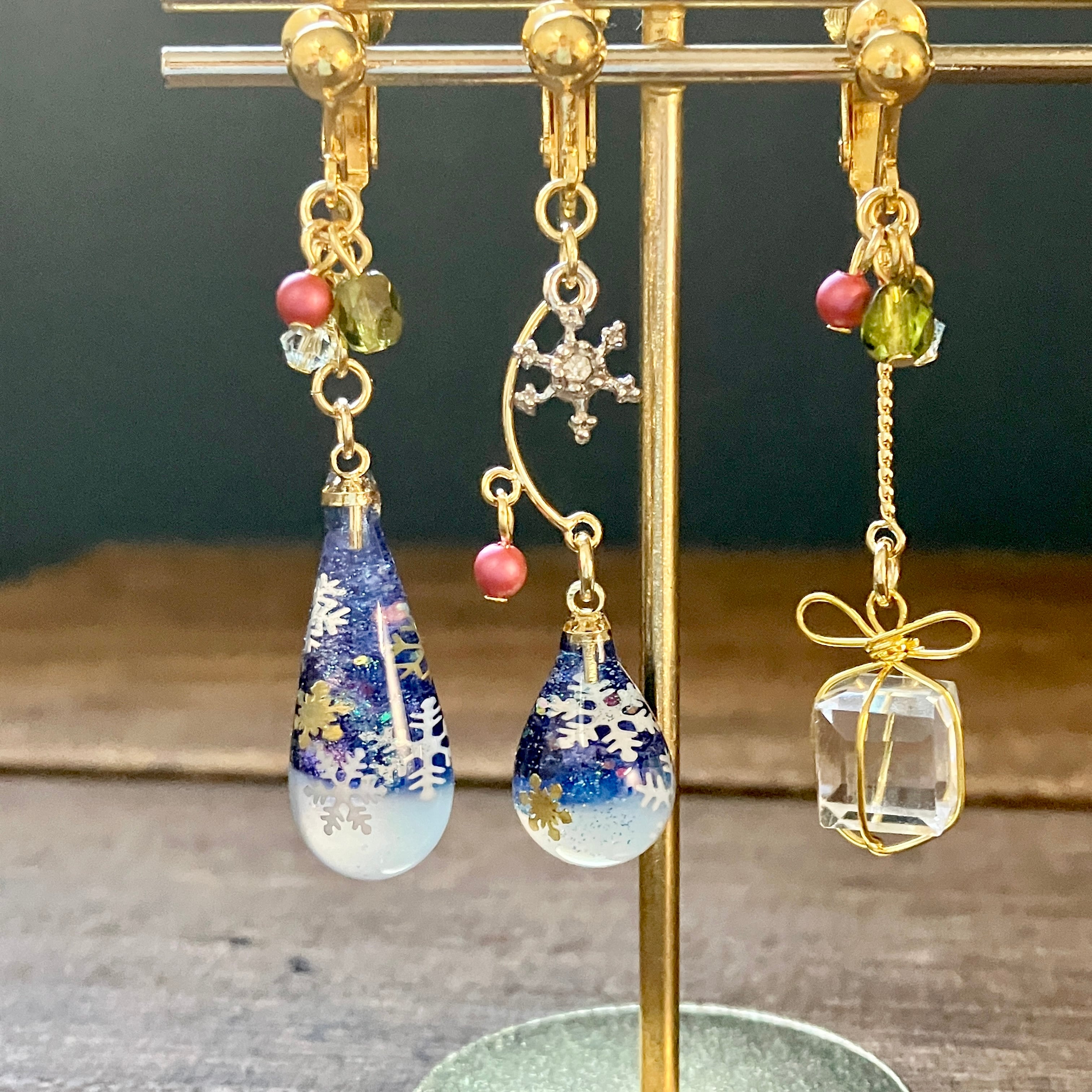 スワロフスキーもワンポイントに取り付けて、冬限定の耳飾りに仕上げました。