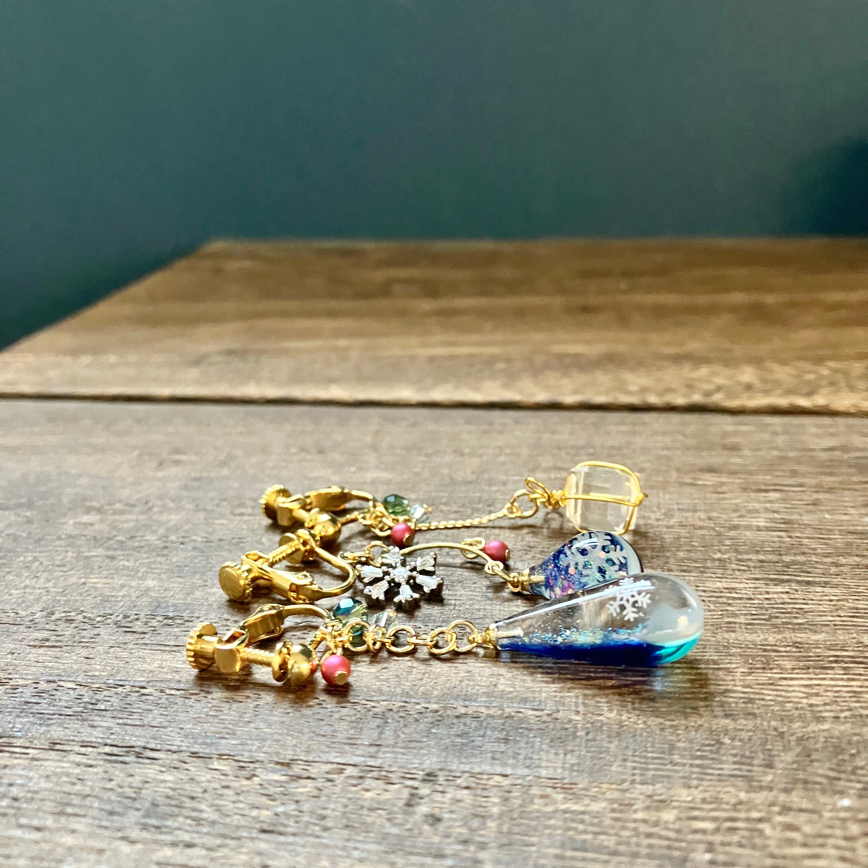 スワロフスキーもワンポイントに取り付けて、冬限定の耳飾りに仕上げました。