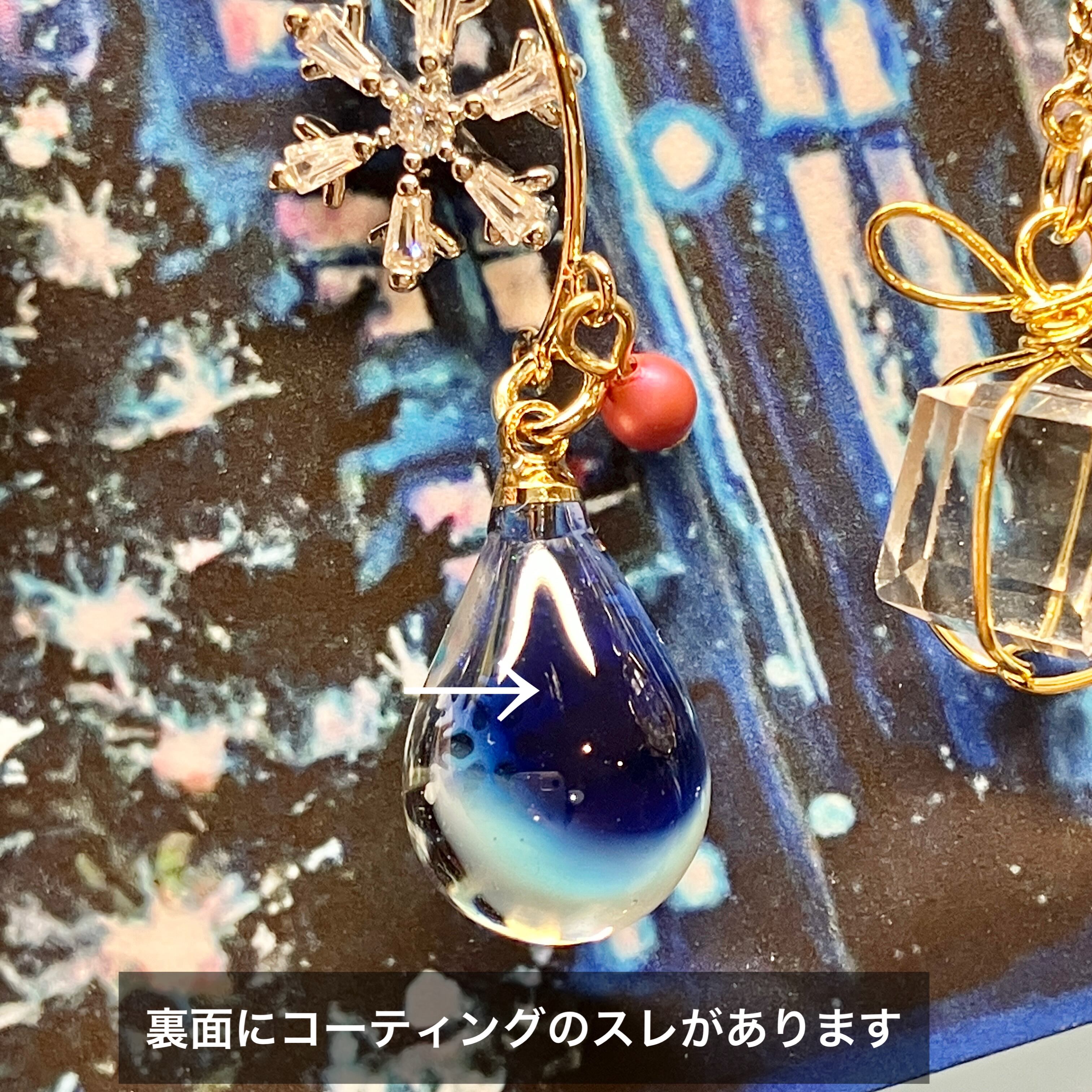スワロフスキーもワンポイントに取り付けて、冬限定の耳飾りに仕上げました。