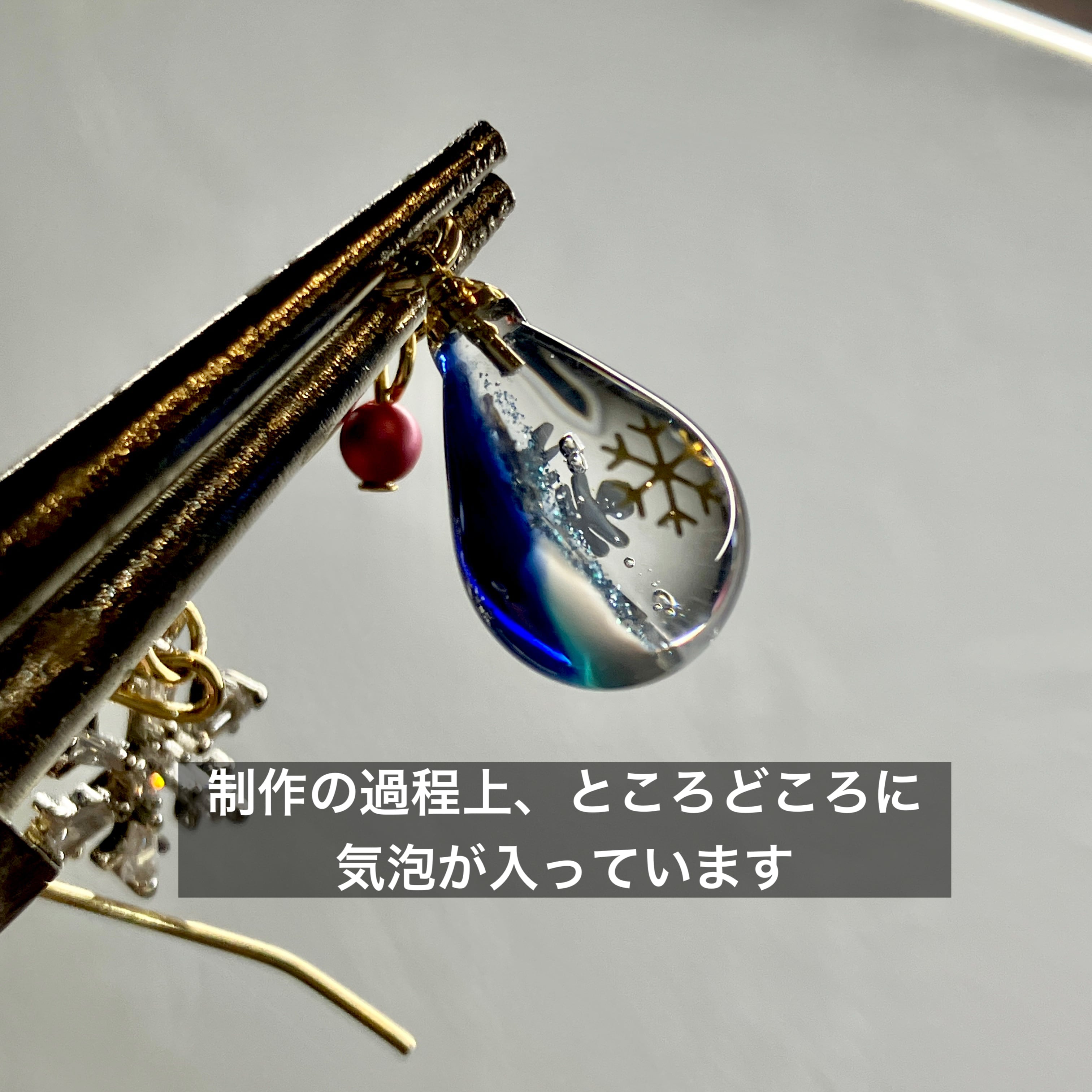 雫型のトップにスノードームのようにキラキラと雪が舞う景色を閉じ込めました。