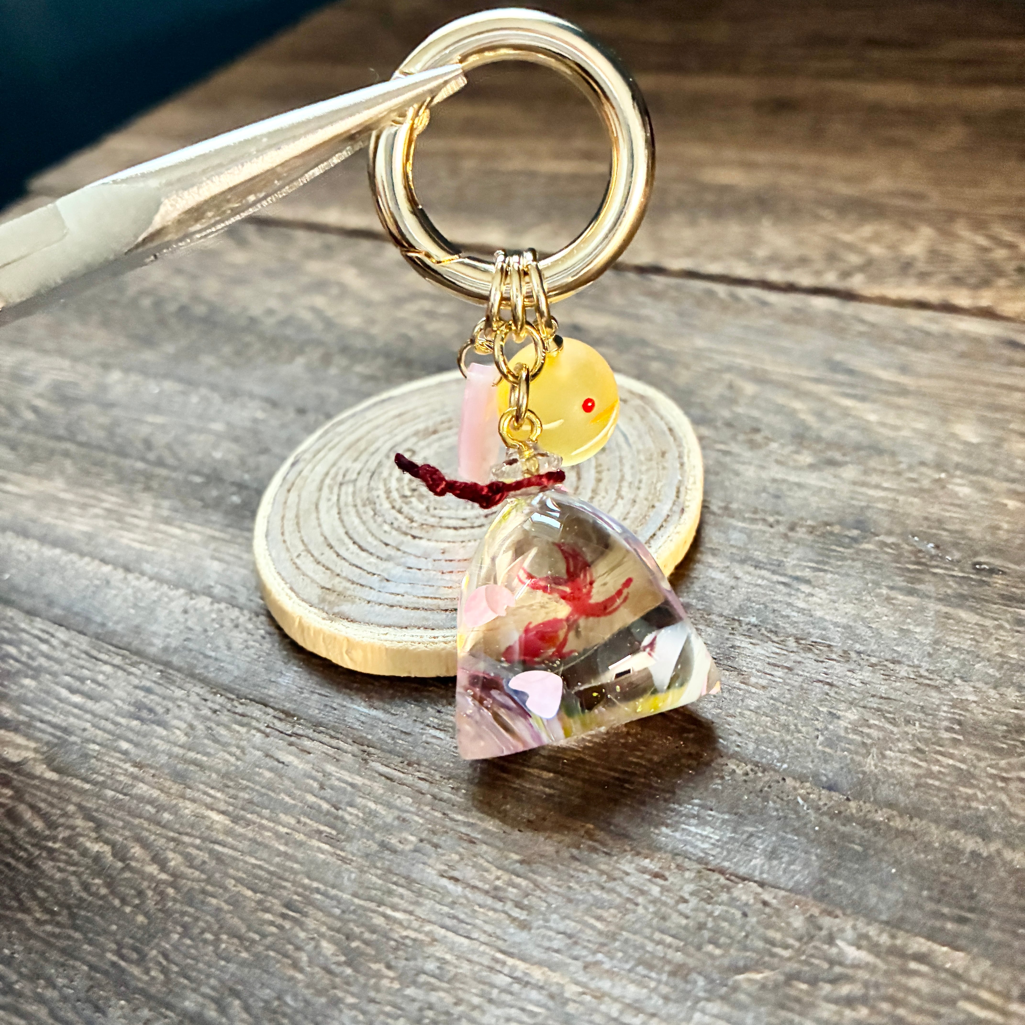 金魚袋にヨーヨーチャームと桜の花びらを組み合わせた春の雰囲気を楽しめるキーホルダーを作りました。