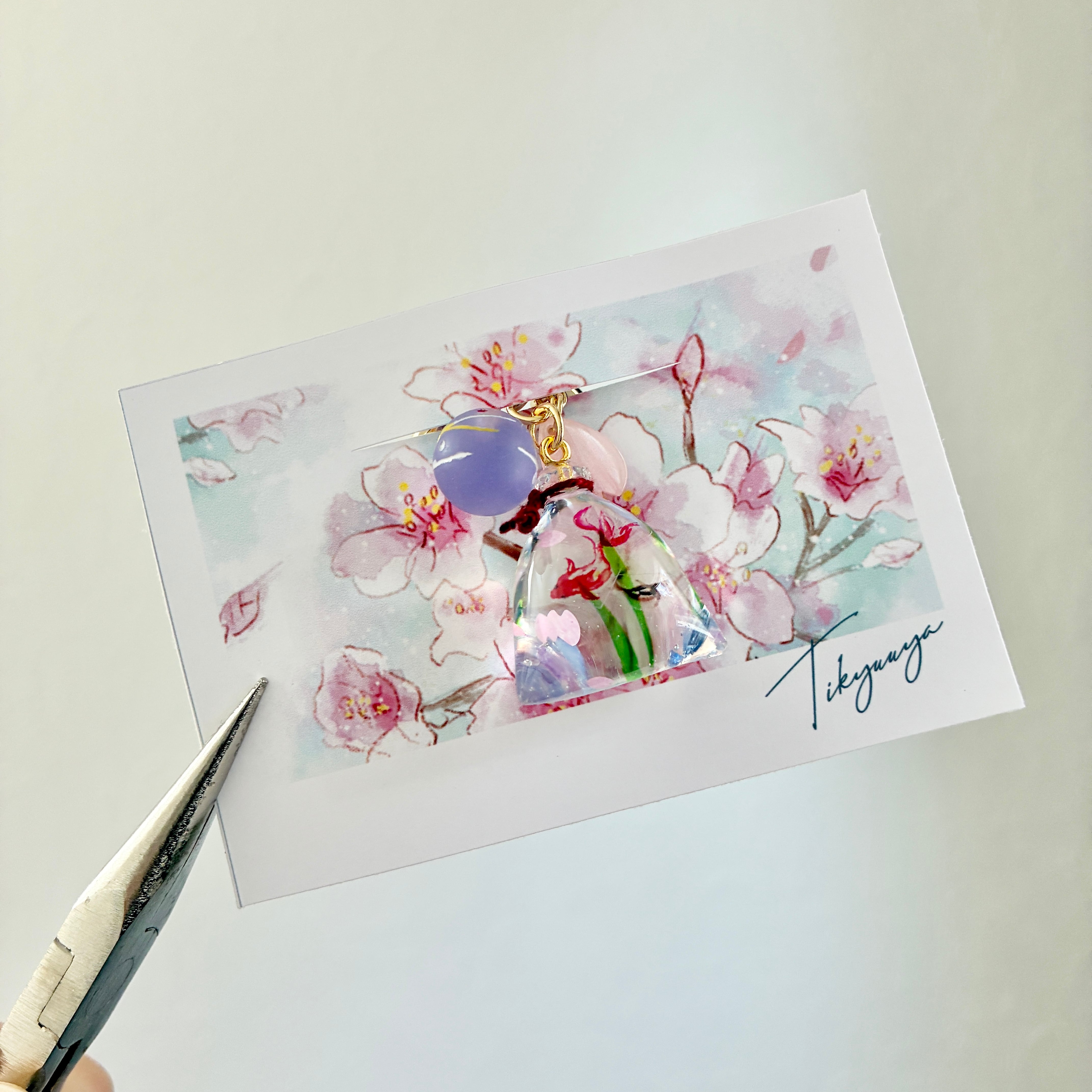 金魚袋にヨーヨーチャームと桜の花びらを組み合わせた春の雰囲気を楽しめるキーホルダーを作りました。