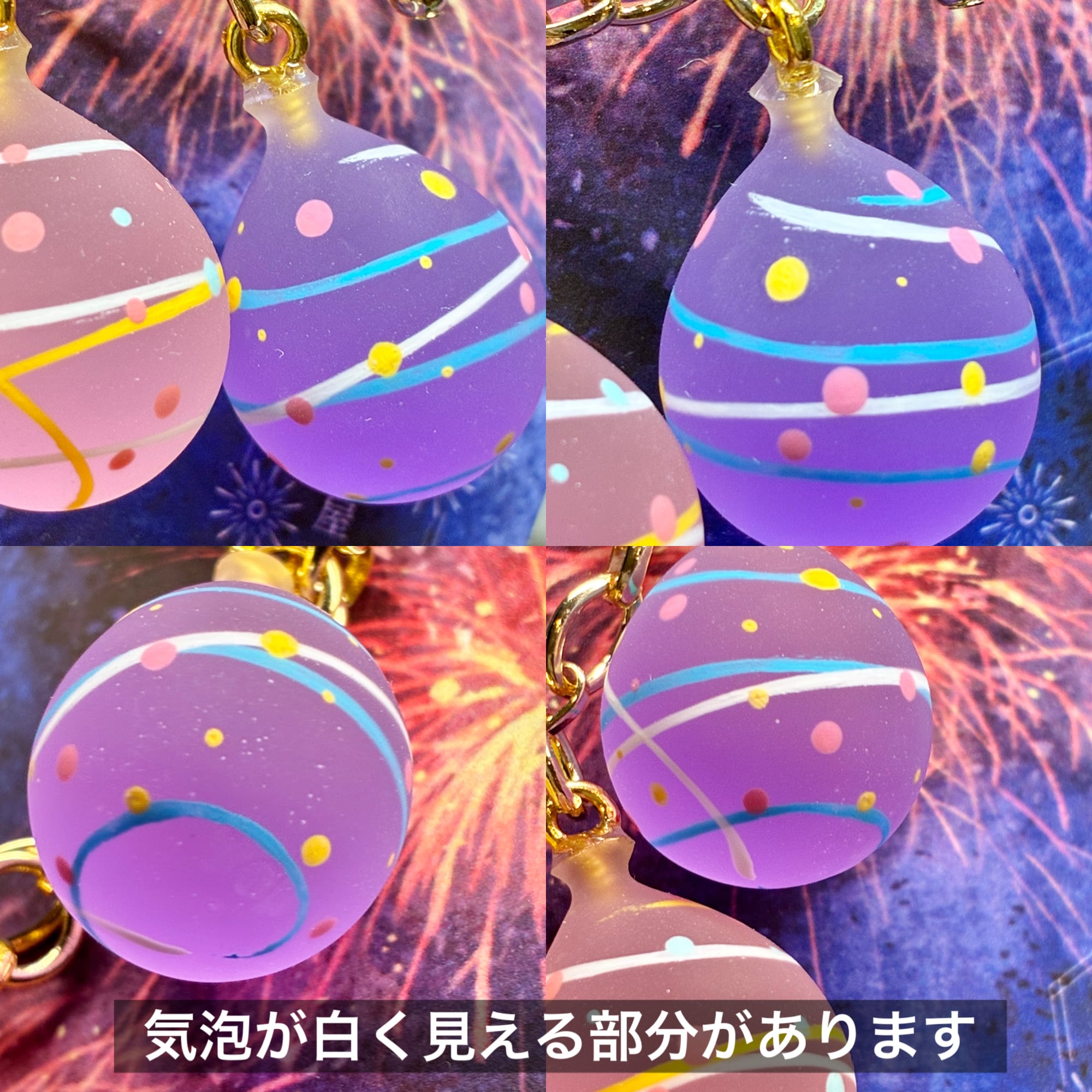 4色の水風船を楽しめるバックチャームを作りました。