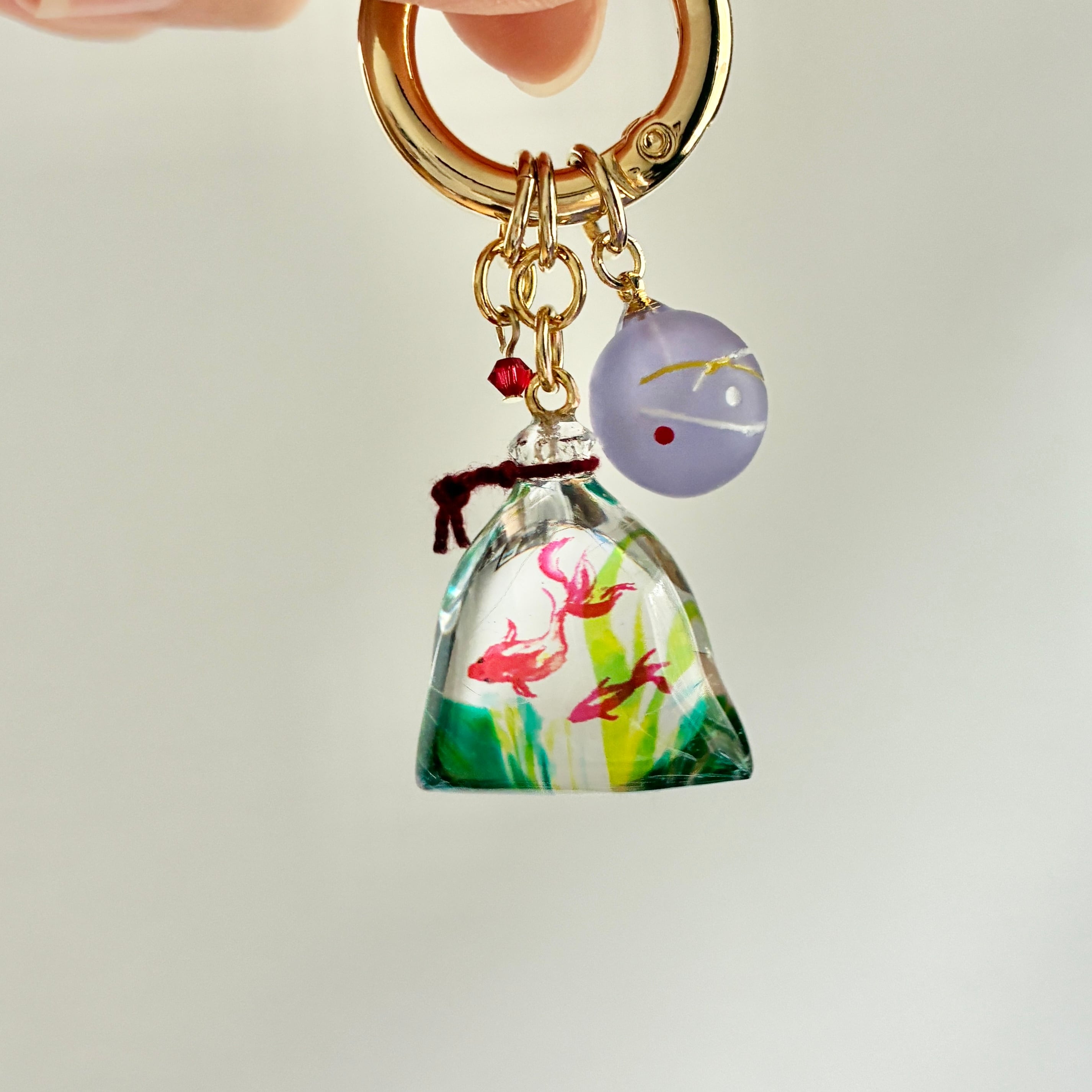 金魚袋にヨーヨーチャームを組み合わせた夏祭りの雰囲気を楽しめるキーホルダーを作りました。