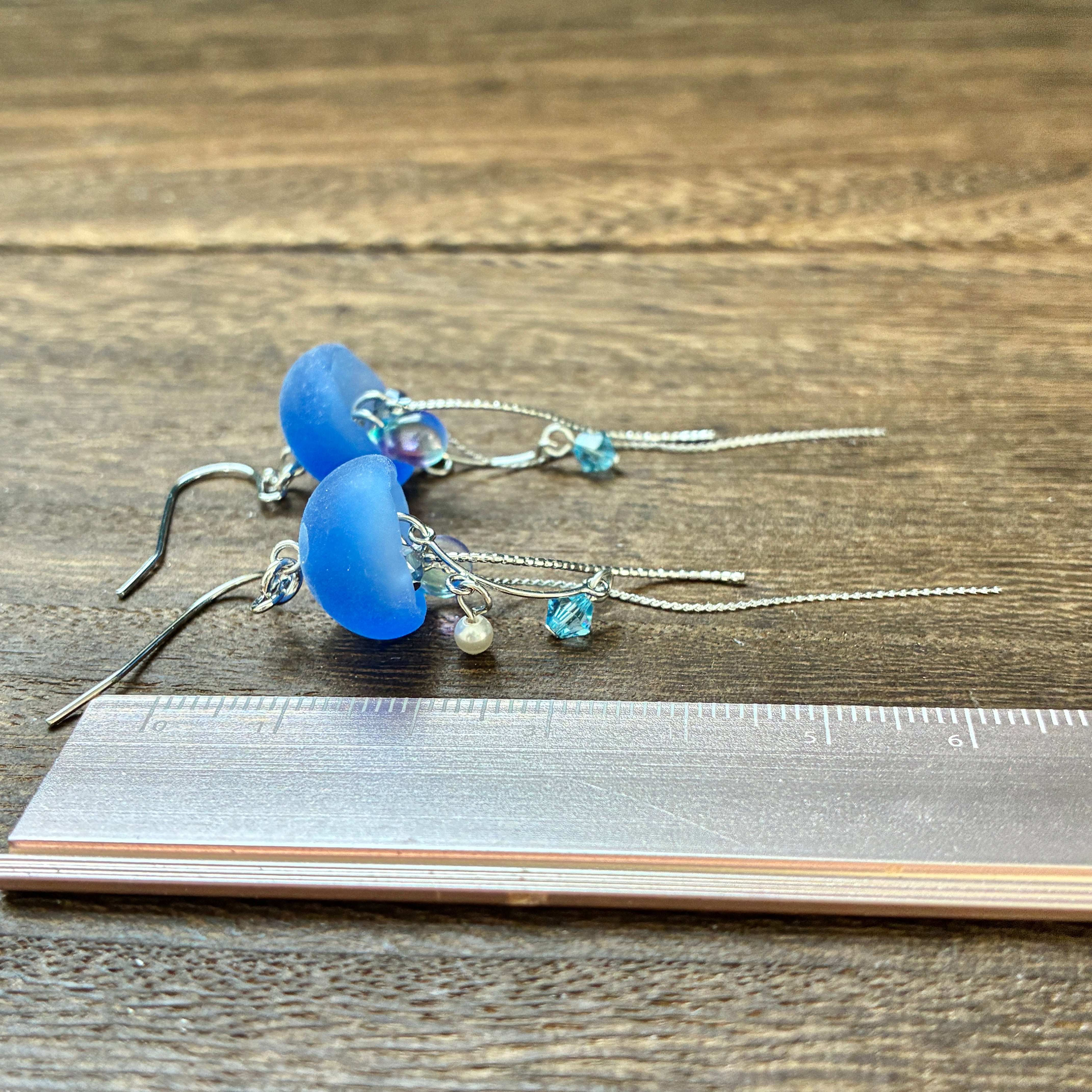 ブルー系統のビーズやパールビーズがキラキラ揺れ、耳元を華やかに彩ってくれます。
