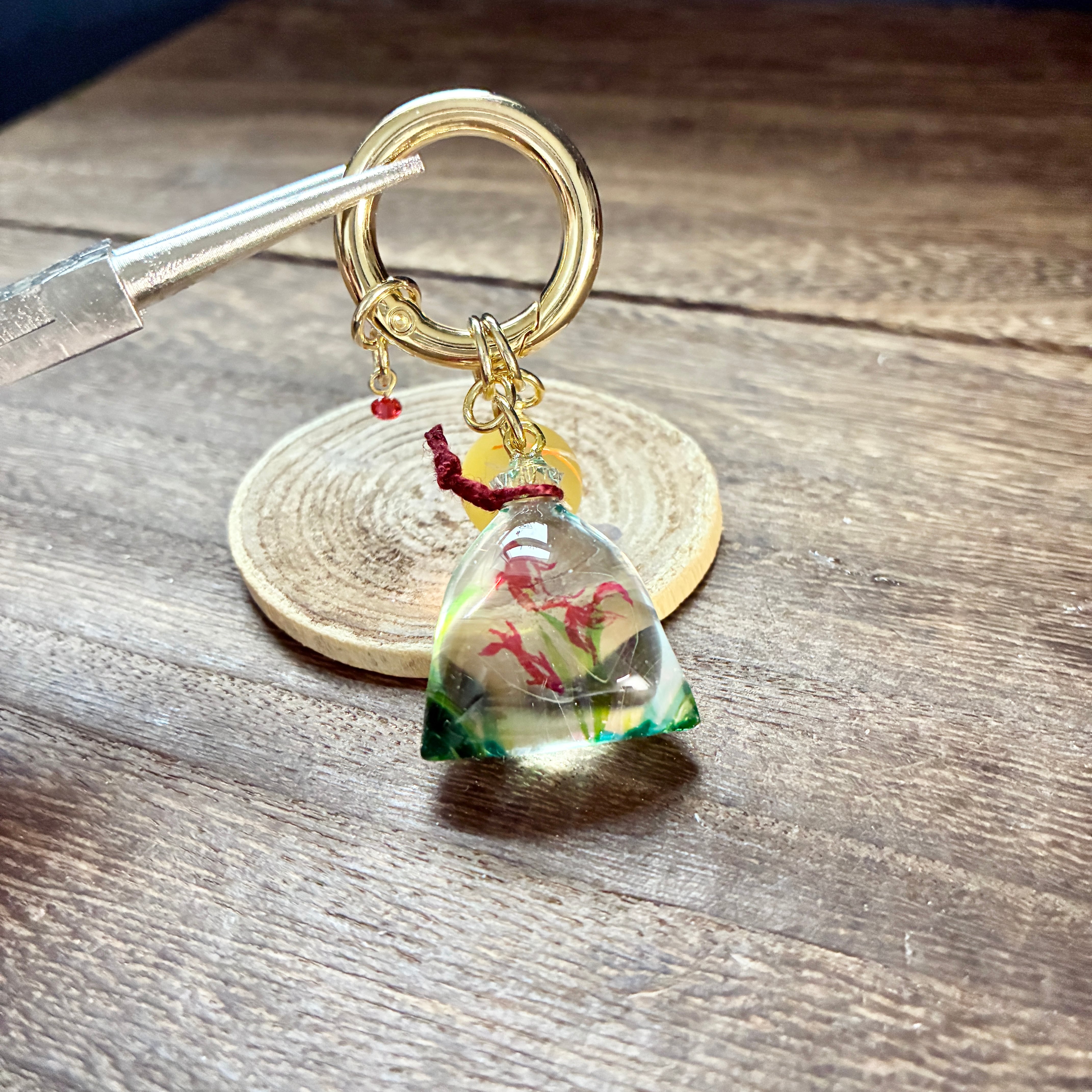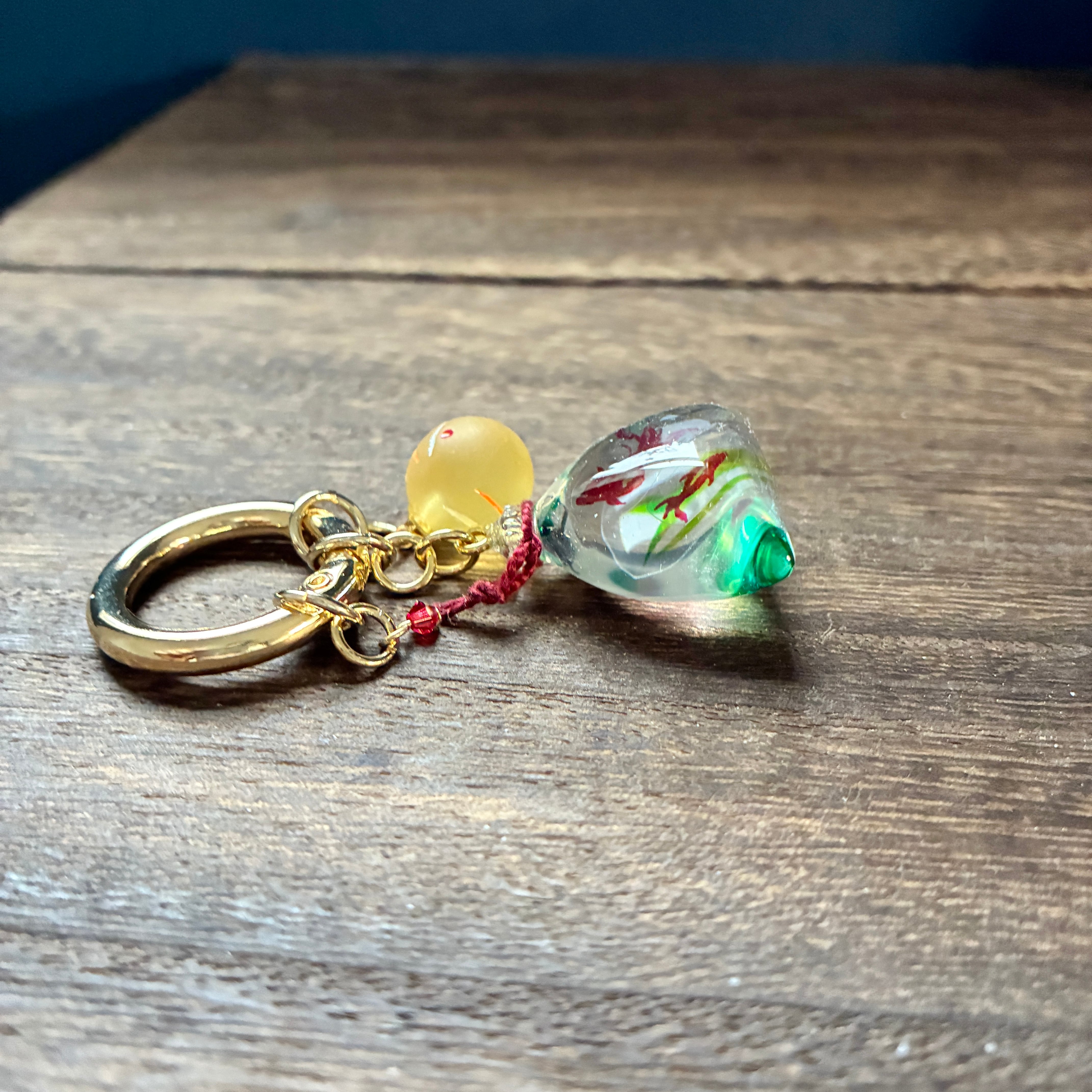 金魚袋にヨーヨーチャームを組み合わせた夏祭りの雰囲気を楽しめるキーホルダーを作りました。