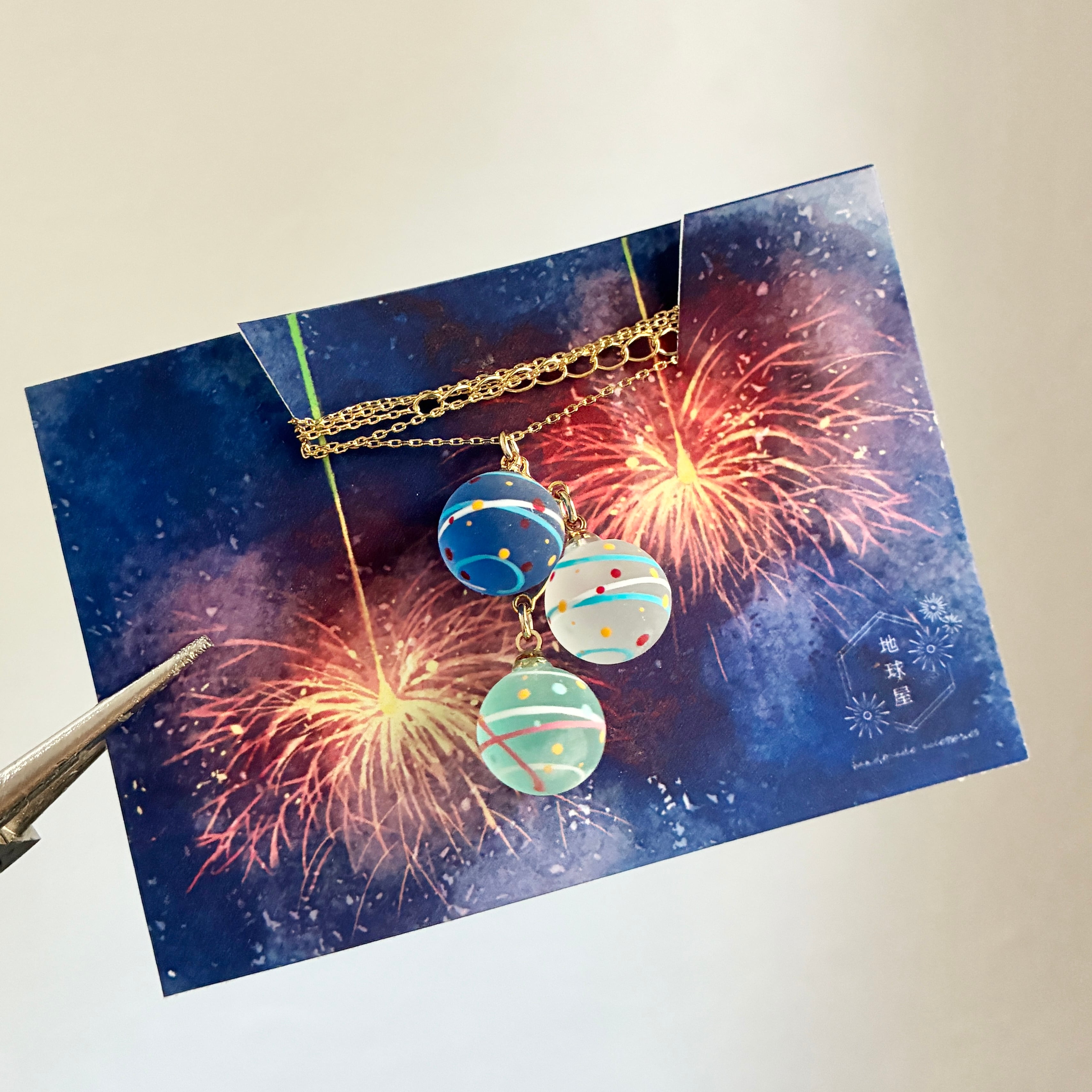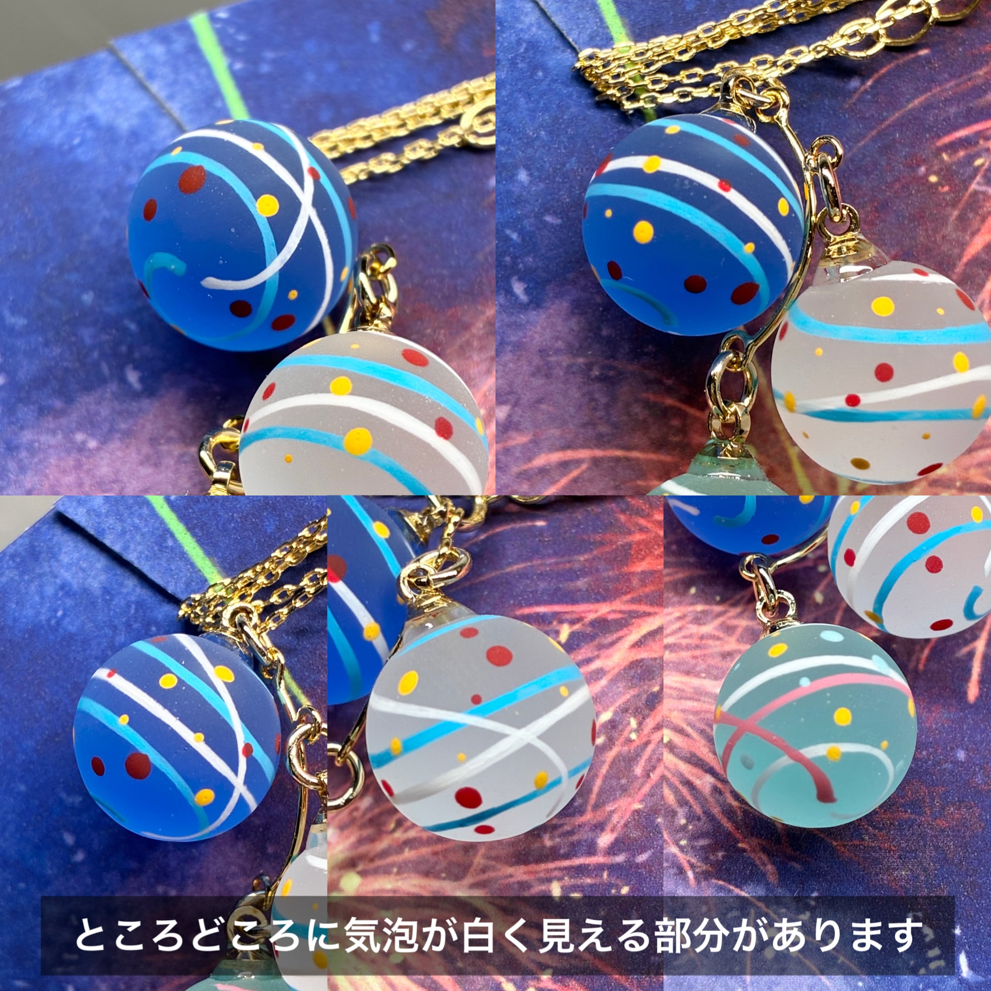 小さな水風船を3色組み合わせてネックレスに仕立てました。