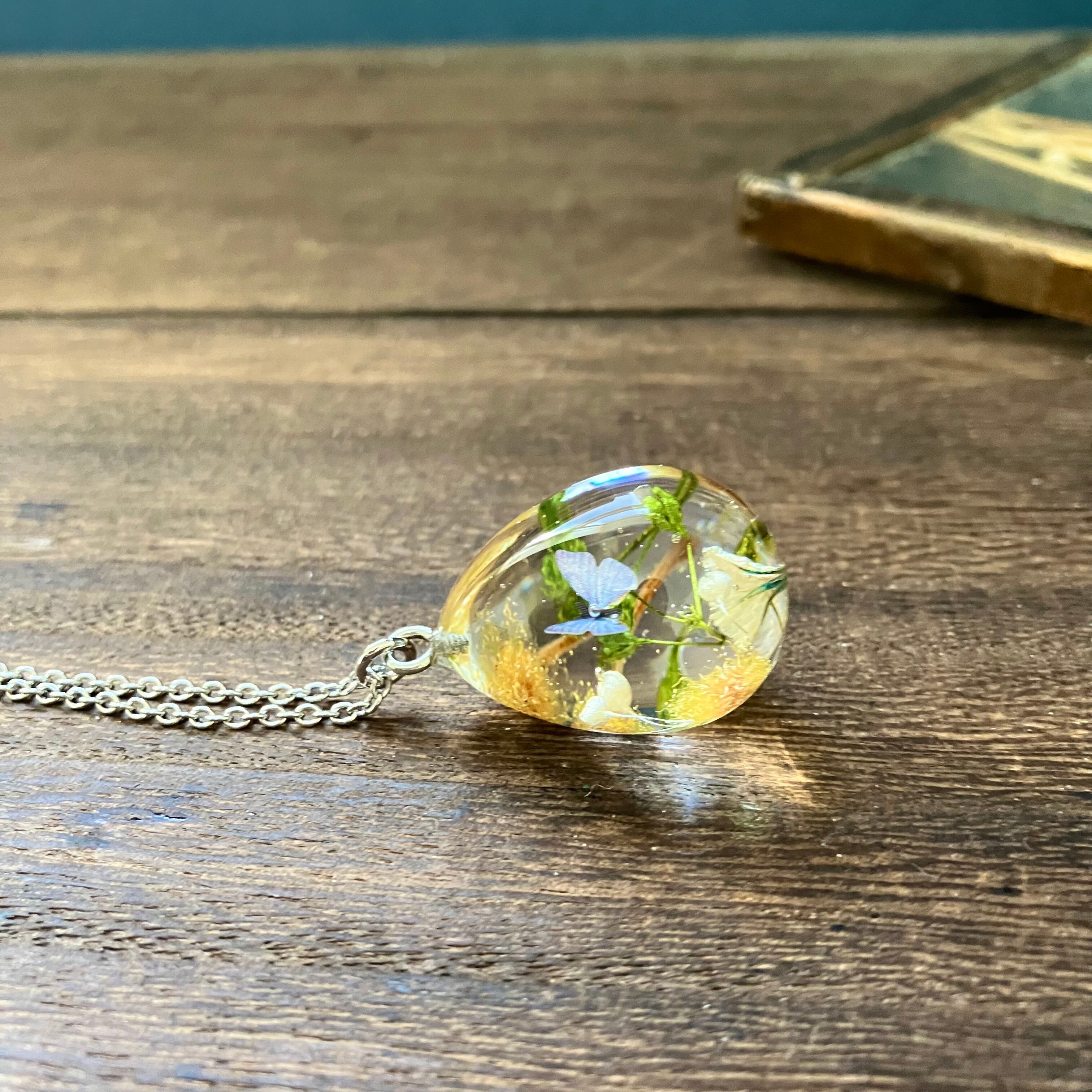 小さな蝶と本物のミモザとかすみ草を閉じ込めています。