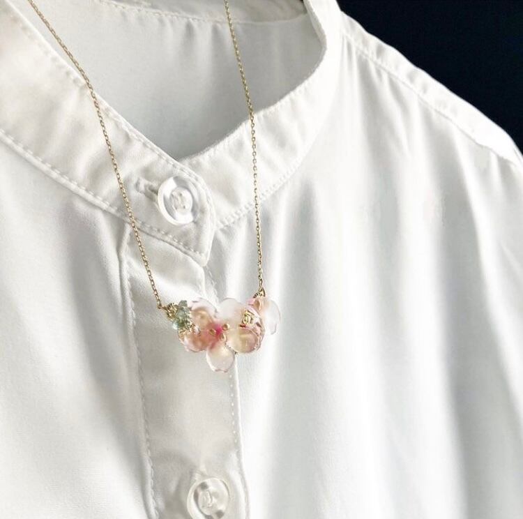 桜のモチーフとお花を閉じ込めた鉱石を組み合わせて春にぴったりのネックレスに仕立てました。
