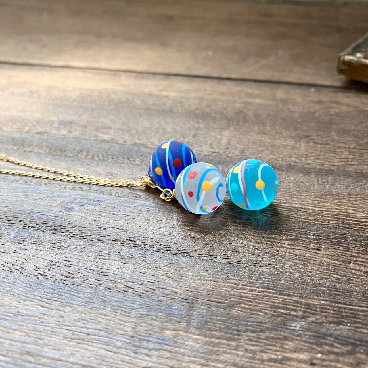 小さな水風船を3色組み合わせてネックレスに仕立てました。