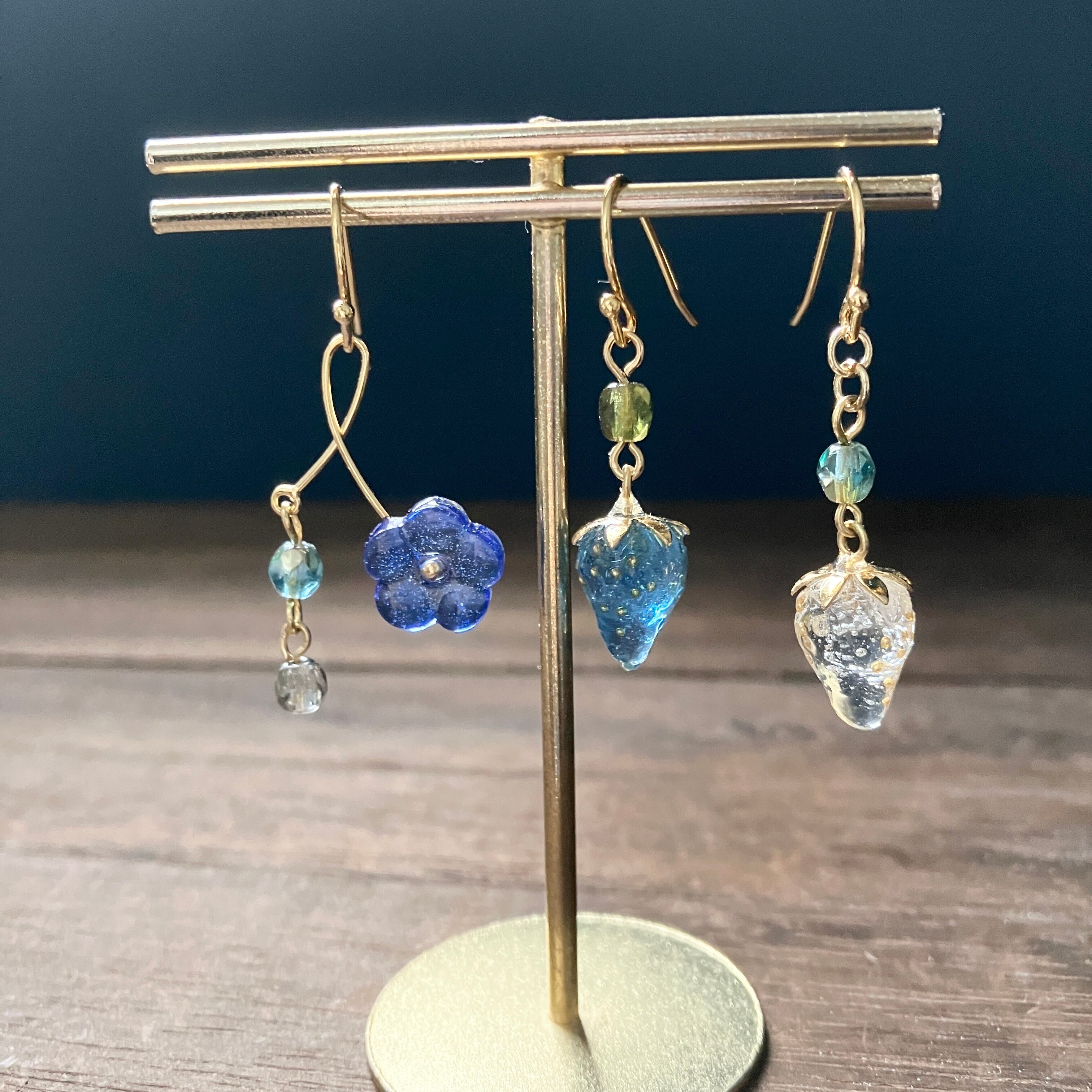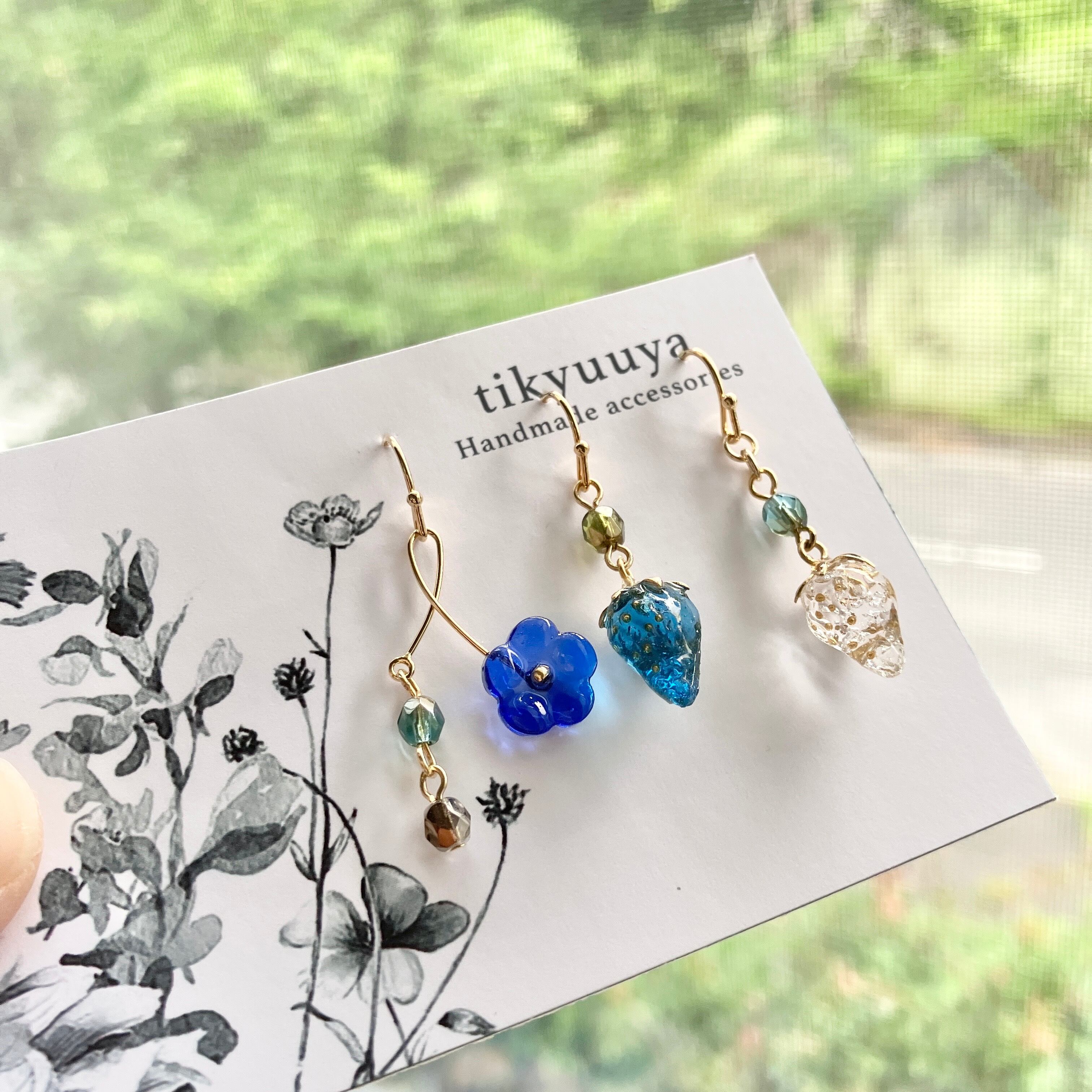 幸せブルーの少し珍しい苺と透明しゅわしゅわの苺、そして苺の花をイメージしたモチーフの3個セットです!