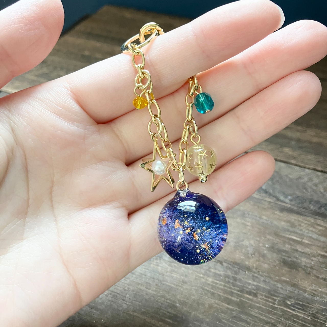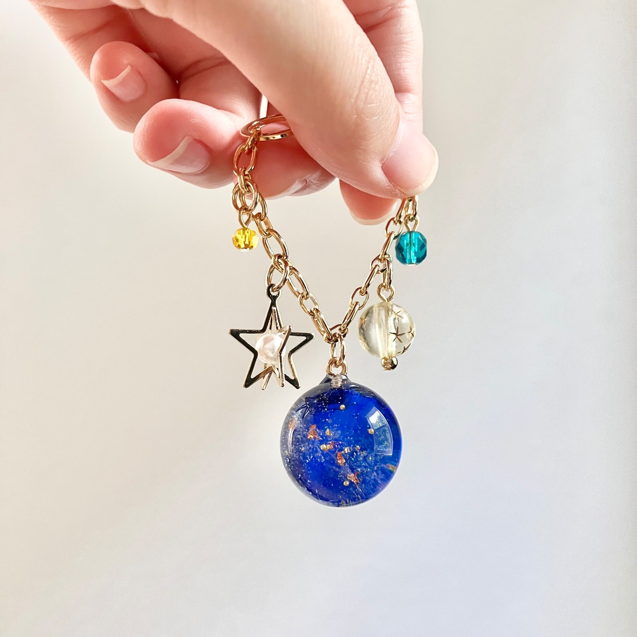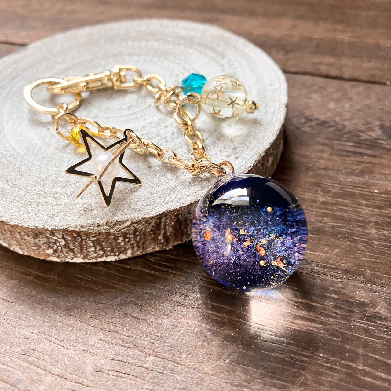 光に当たるとキラキラ星が煌めき、存在感のあるバッグチャームです。