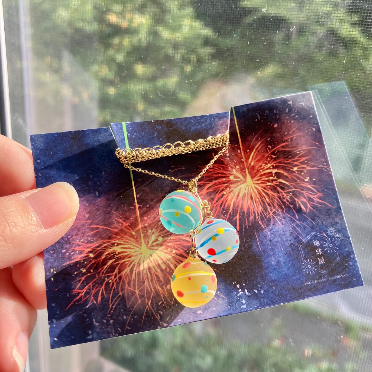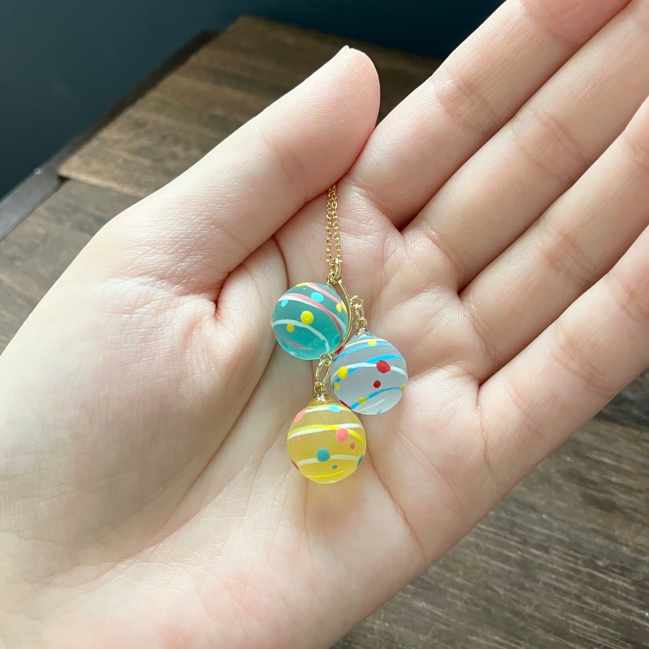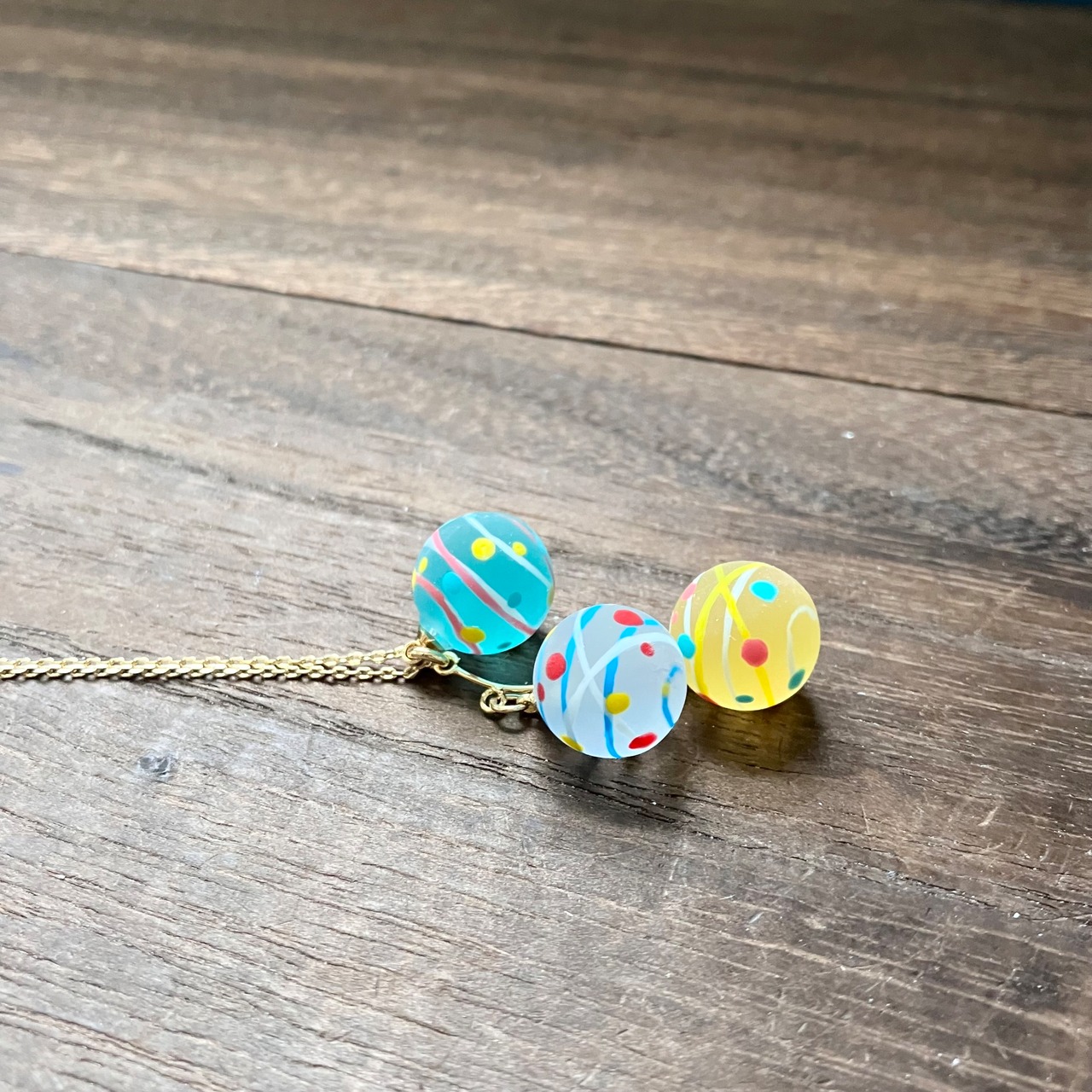 小さな水風船を3色組み合わせてネックレスに仕立てました。
