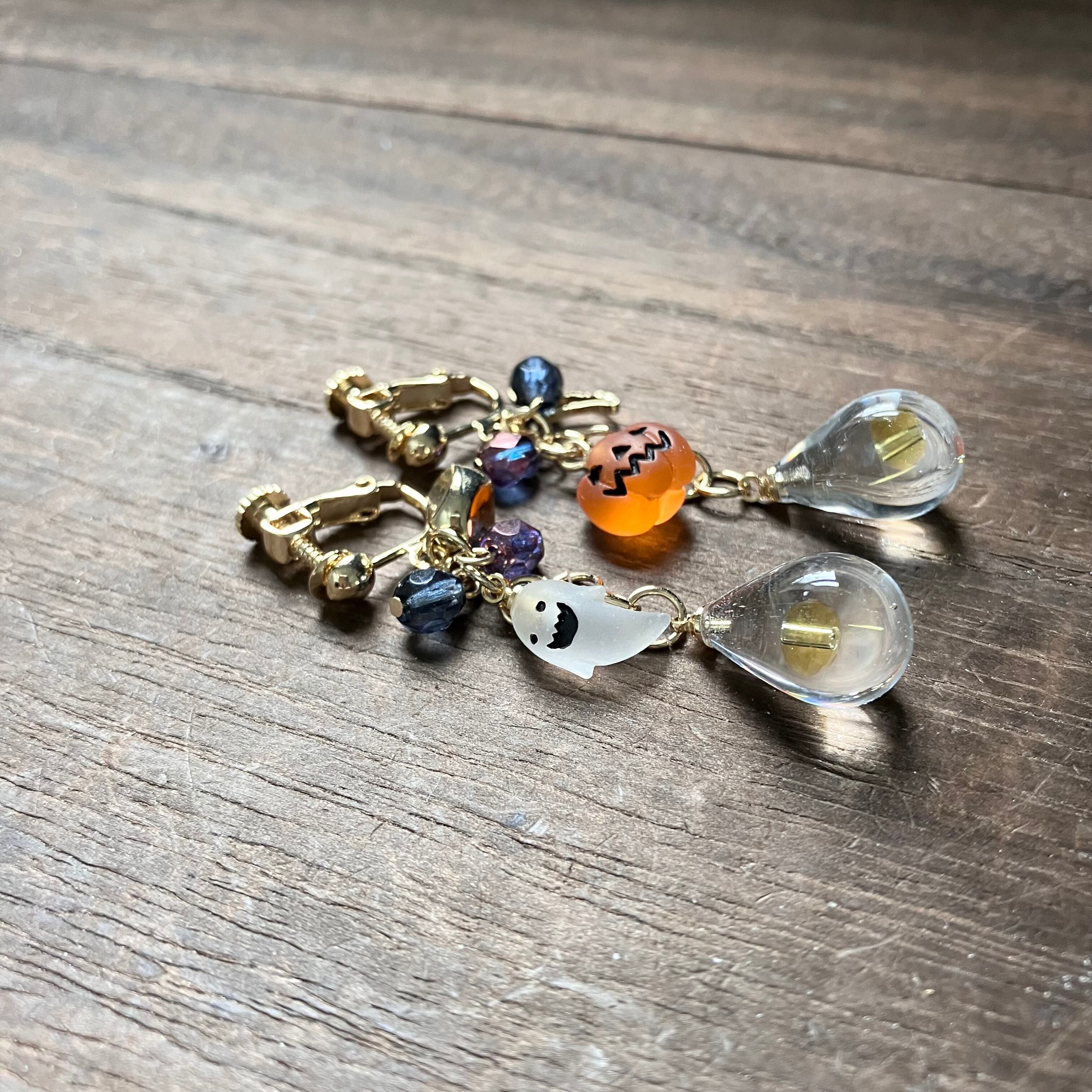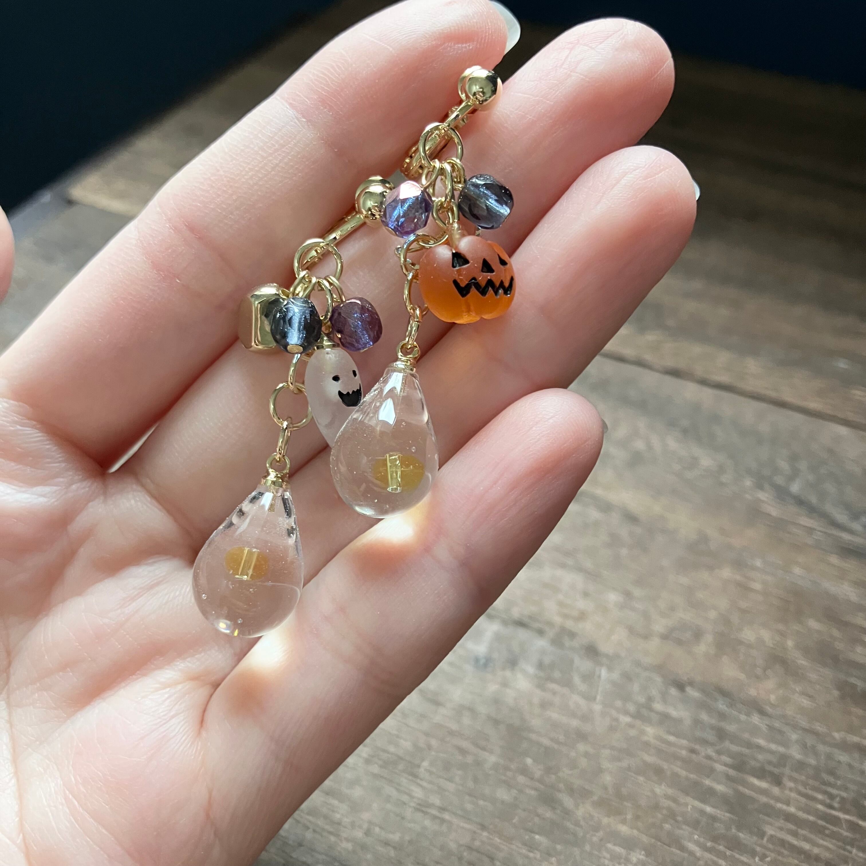 シックな色合いのビーズとオバケ、ジャックオランタンがゆらゆら揺れる存在感のある耳飾りです。