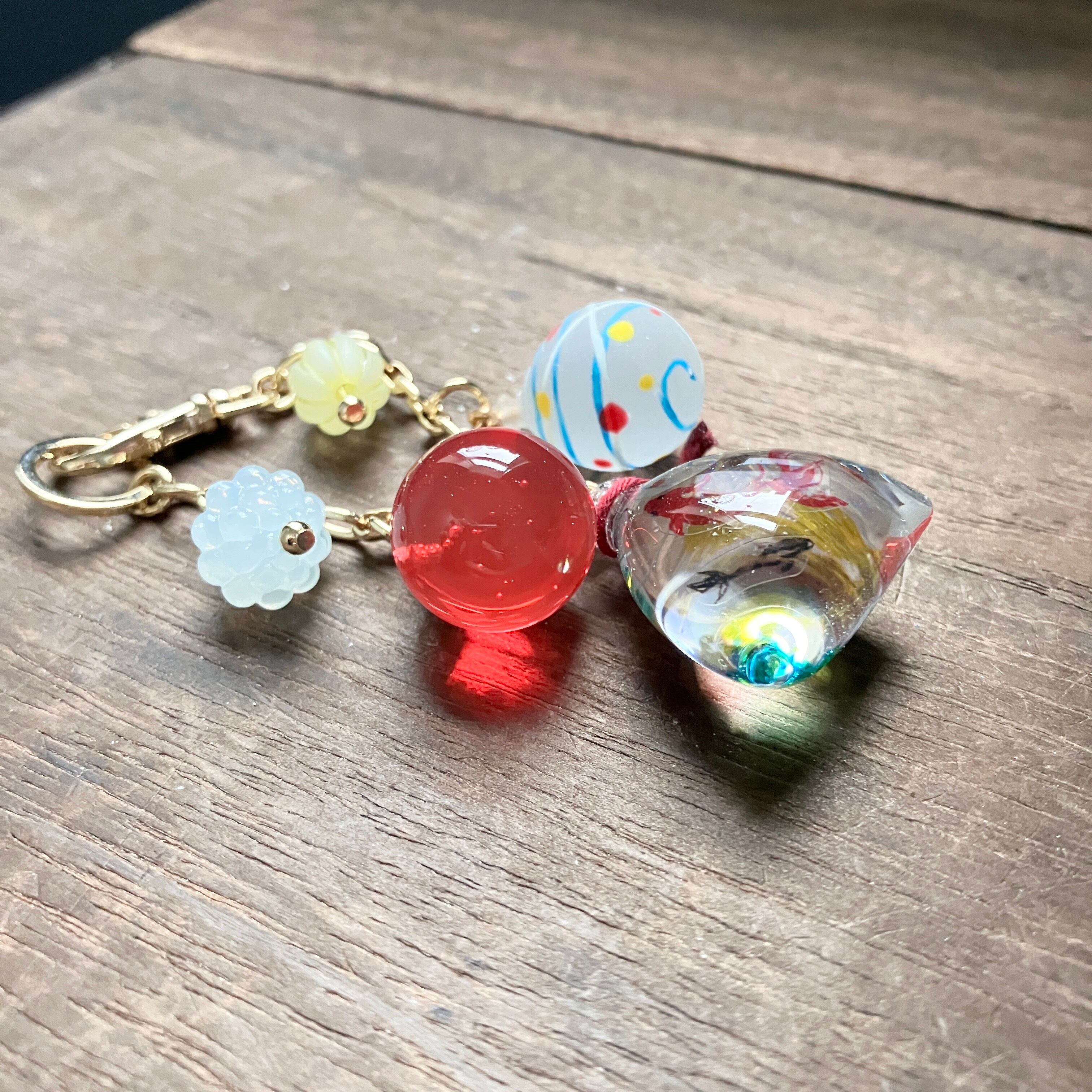 金魚すくい、りんご飴、水風船を組み合わせた夏祭りの雰囲気を楽しめるバックチャームを作りました。