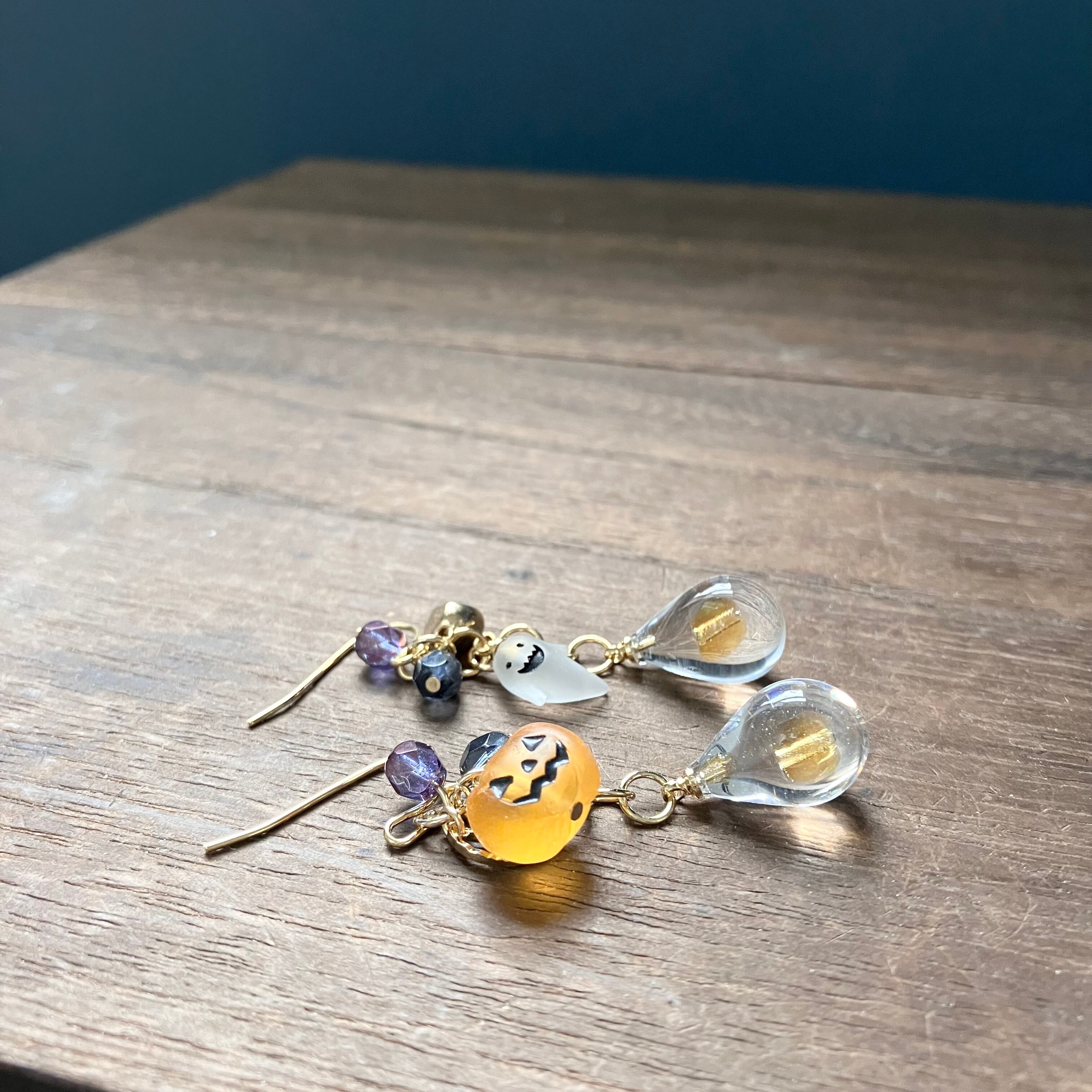 シックな色合いのビーズとオバケ、ジャックオランタンがゆらゆら揺れる存在感のある耳飾りです。