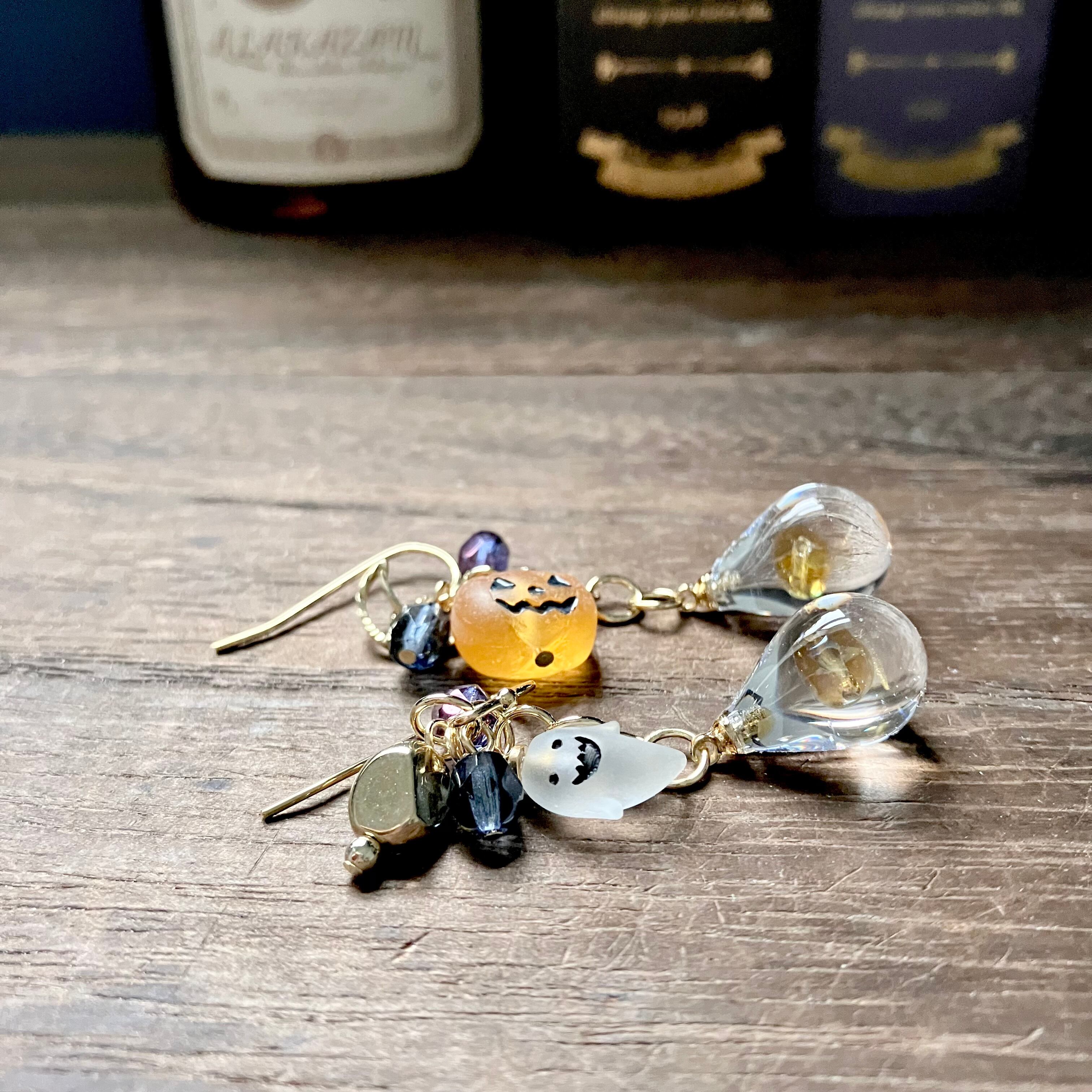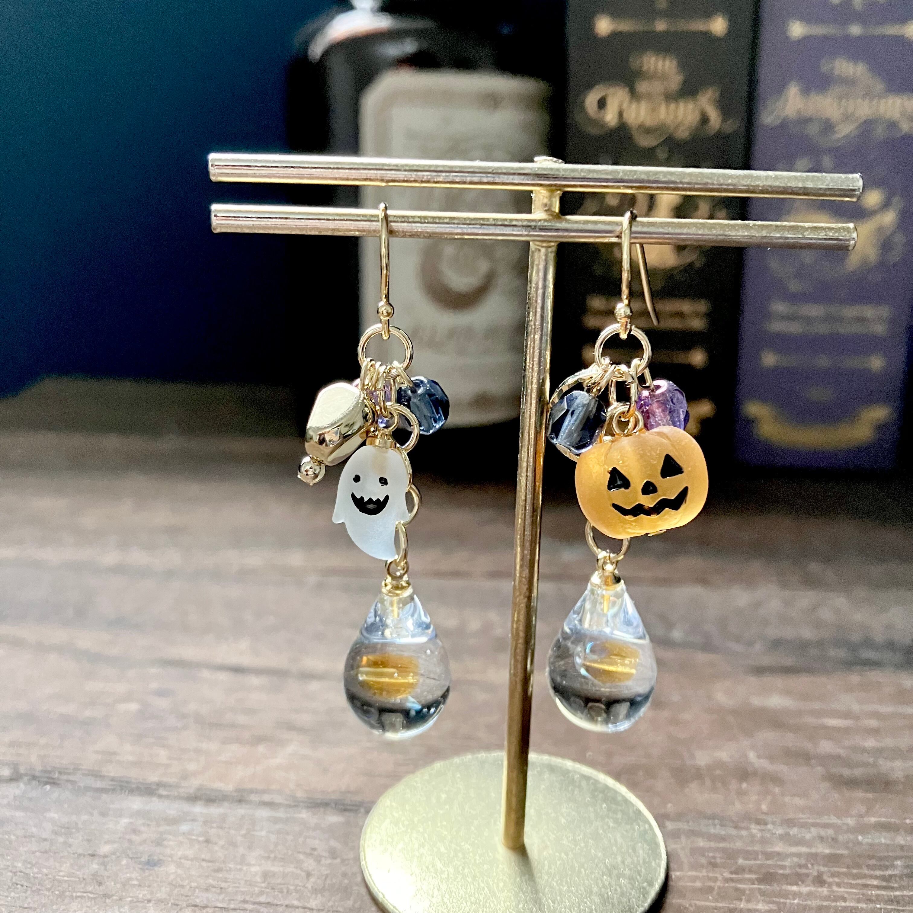シックな色合いのビーズとオバケ、ジャックオランタンがゆらゆら揺れる存在感のある耳飾りです。