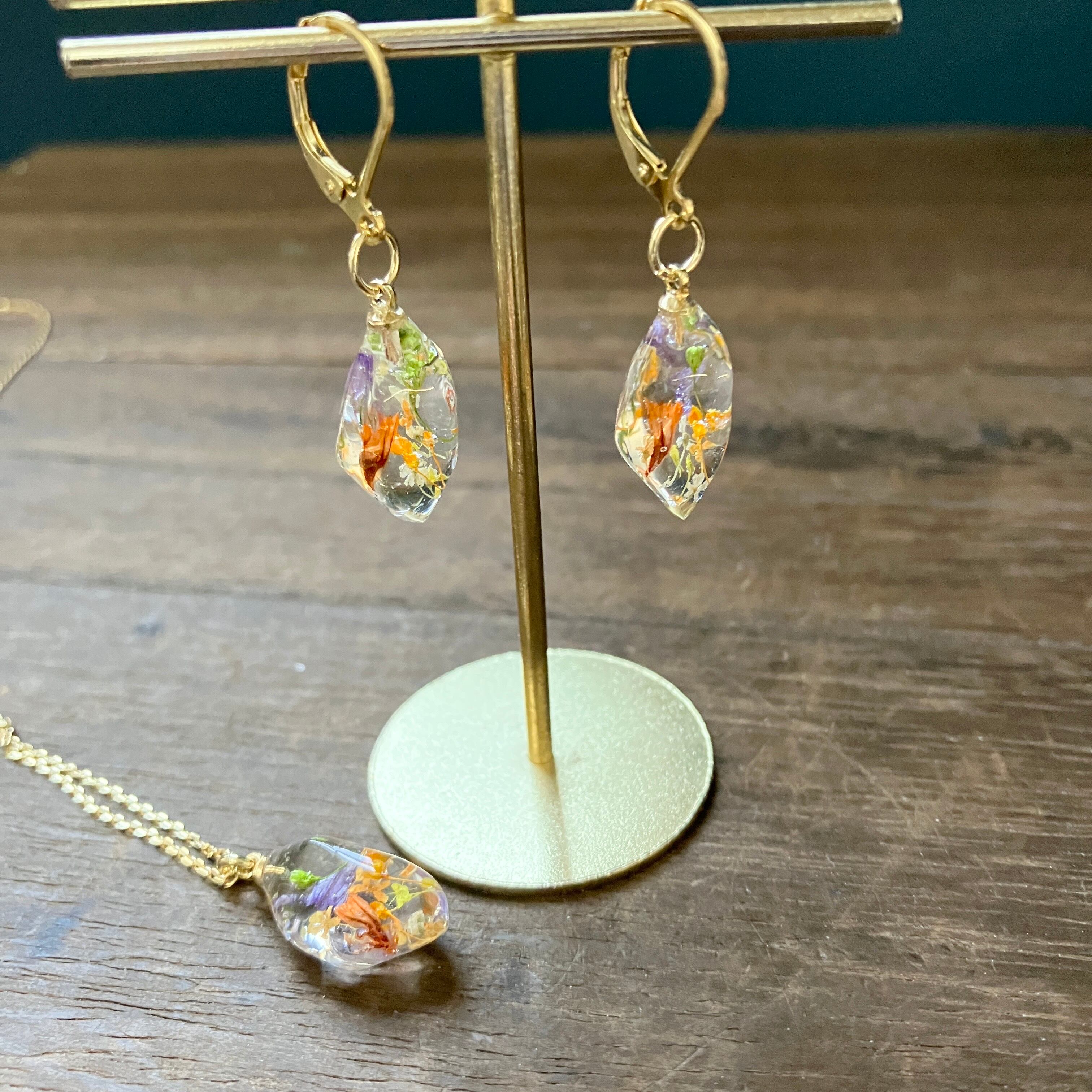 小さな鉱石ピアス&ネックレス 秋色花鉱石