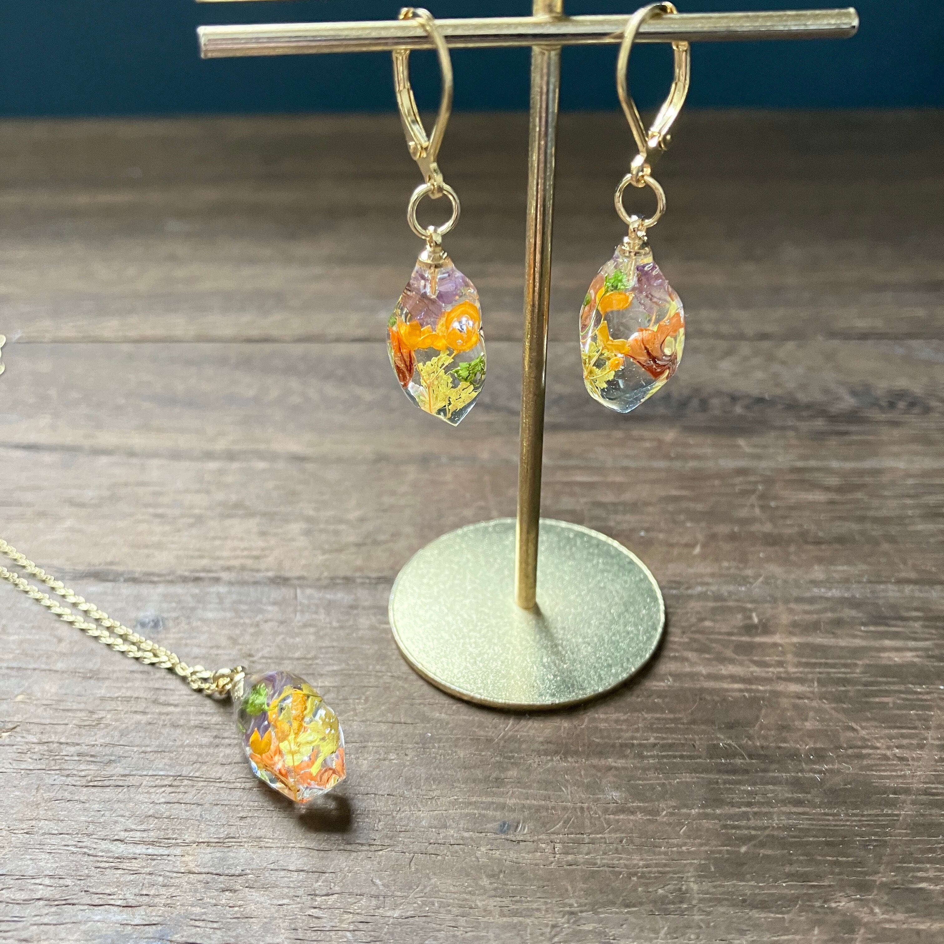小さな鉱石ピアス&ネックレス 秋色花鉱石