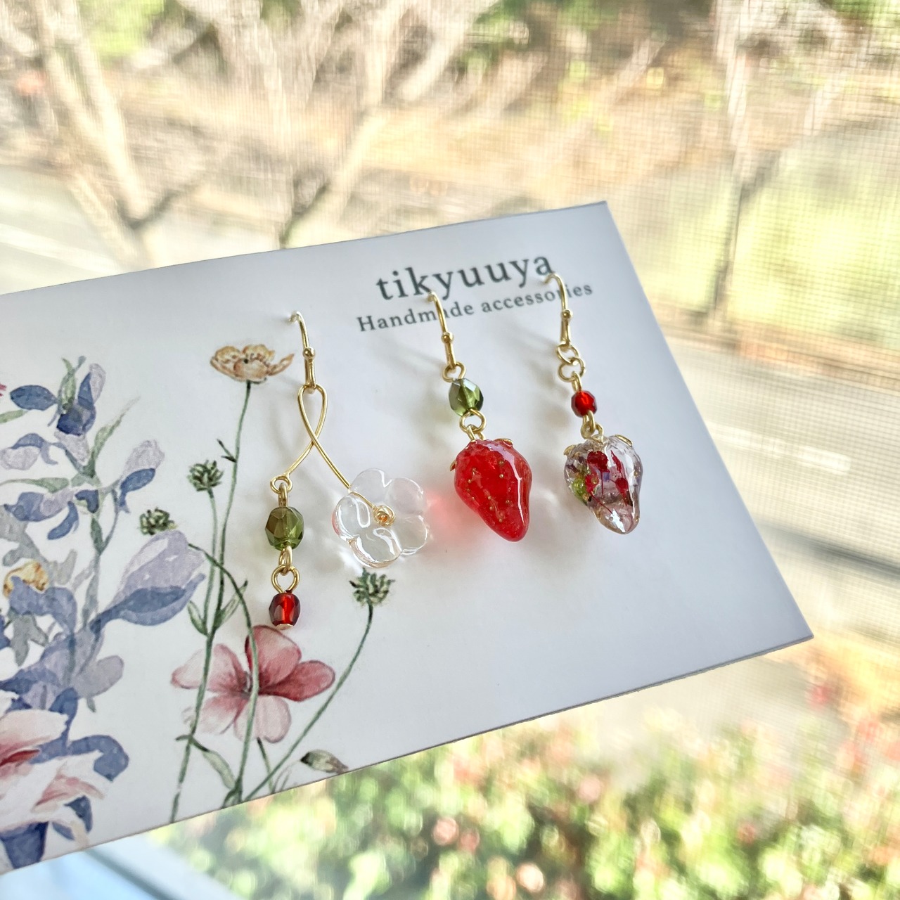 まっ赤な苺とお花入りの苺、そして苺の花をイメージしたモチーフの3個セットです!