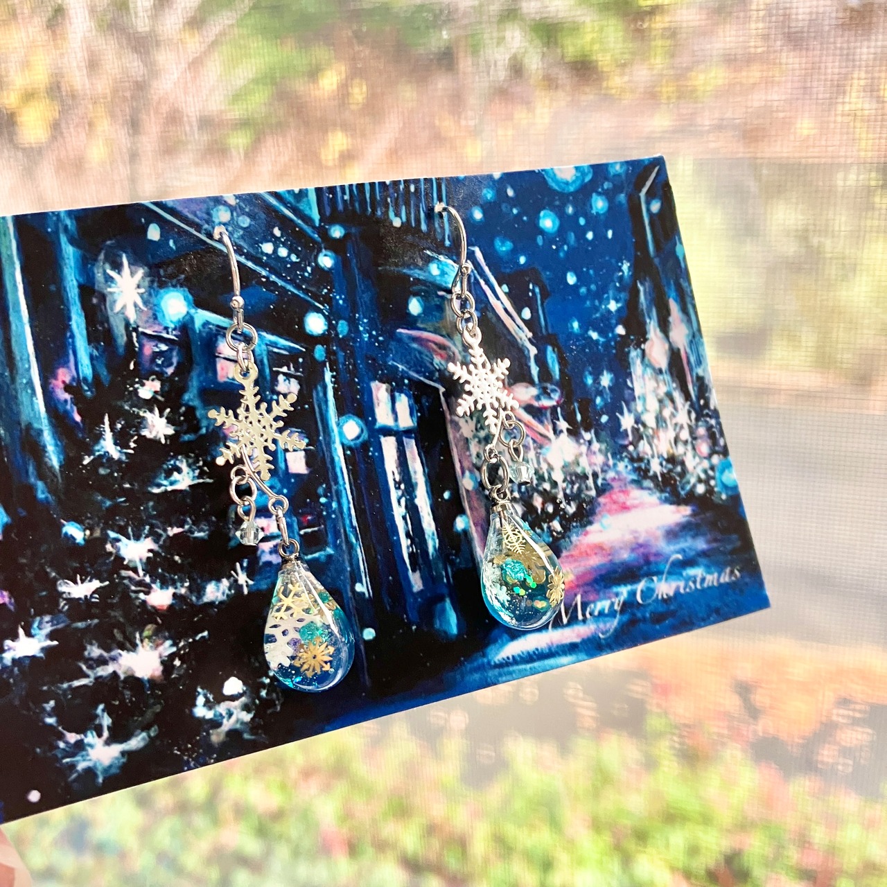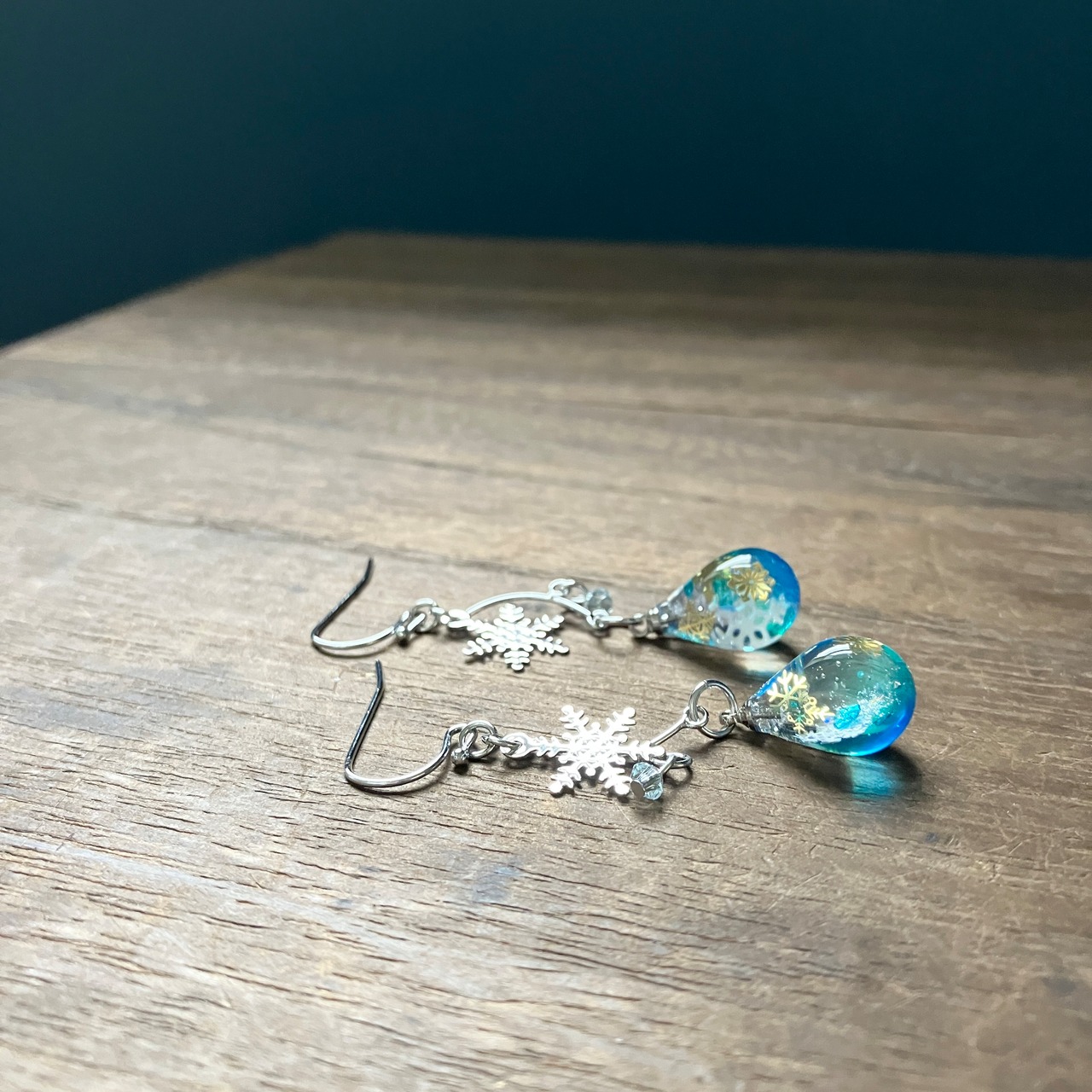 雫型のトップにスノードームのようにキラキラと雪が舞う景色を閉じ込めました。