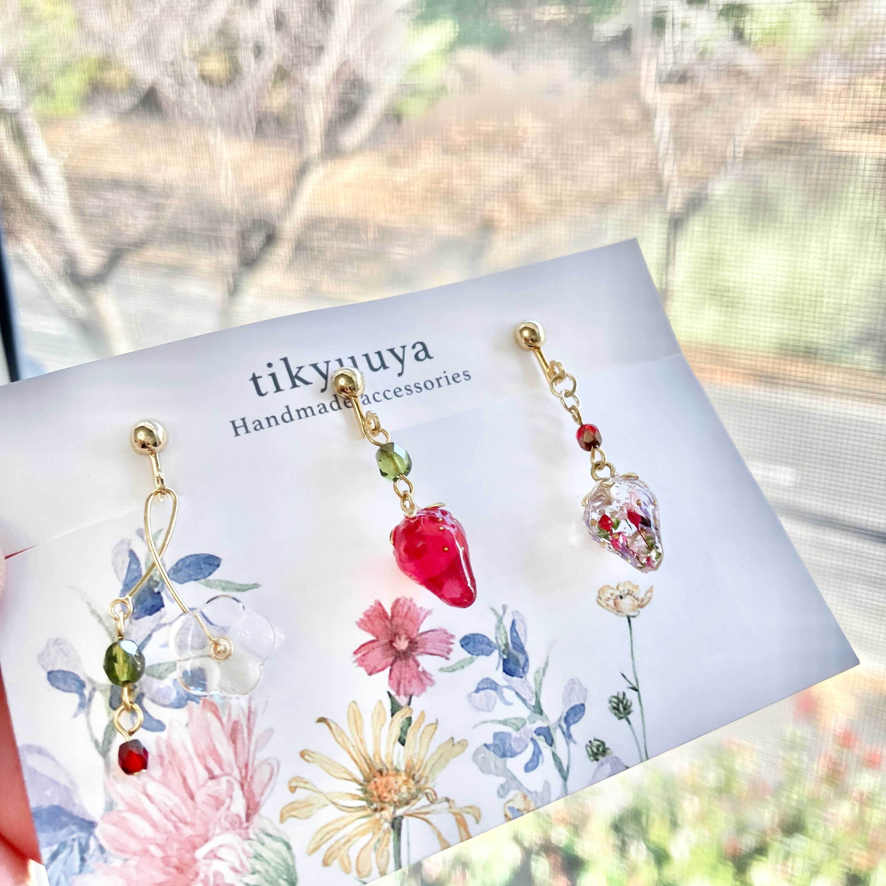 まっ赤な苺とお花入りの苺、そして苺の花をイメージしたモチーフの3個セットです!