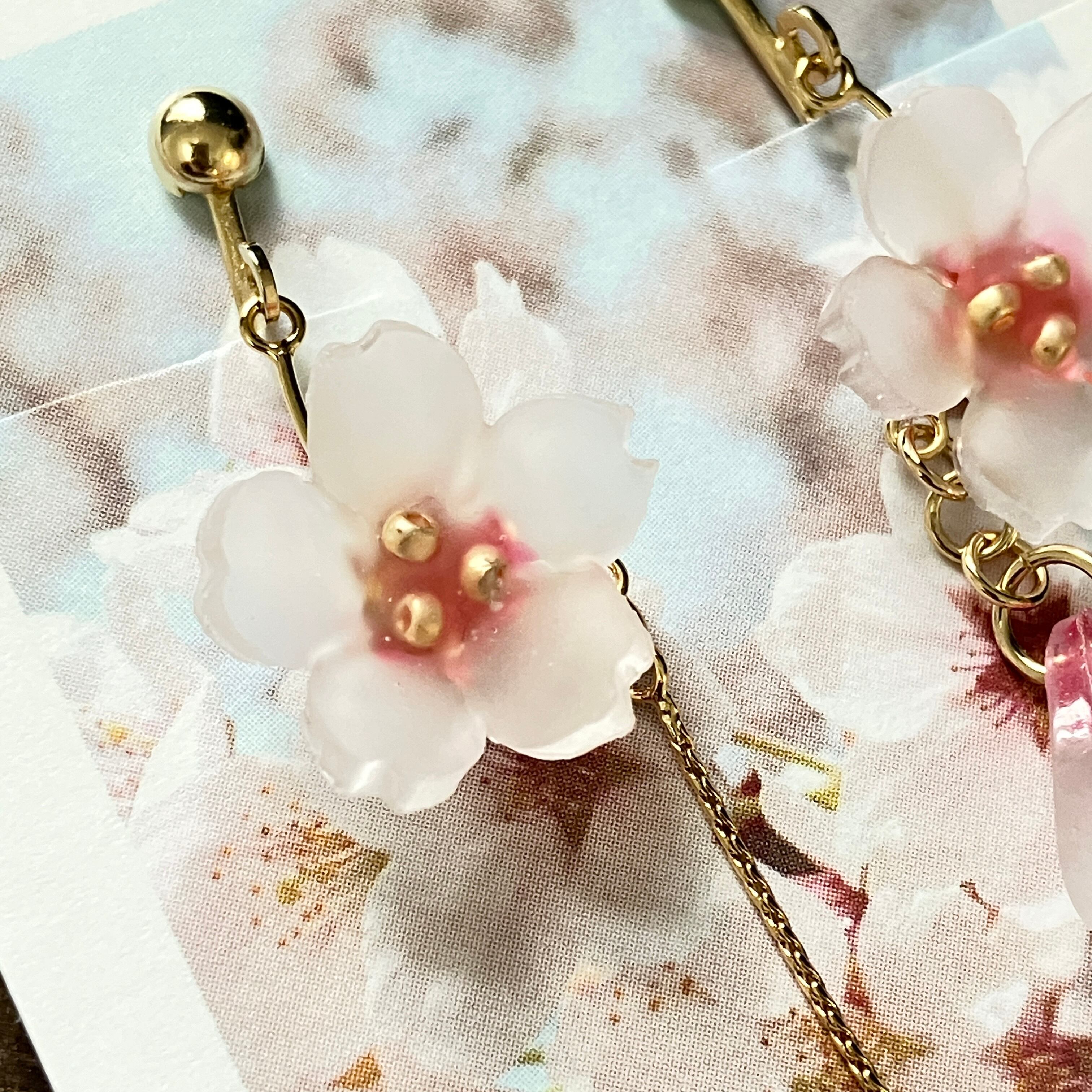 レジンで桜のふんわりとした花とゆらゆら揺れる花びらを作りました。